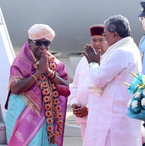 ದೆಹಲಿಯಿಂದ ಬೆಂಗಳೂರಿನ ಕೆಂಪೇಗೌಡ ಅಂತಾರಾಷ್ಟ್ರೀಯ ವಿಮಾನ ನಿಲ್ದಾಣಕ್ಕೆ ಆಗಮಿಸಿದ ರಾಷ್ಟ್ರಪತಿ ದ್ರೌಪದಿ ಮುರ್ಮು ಅವರನ್ನು ಮುಖ್ಯಮಂತ್ರಿ ಸಿದ್ದರಾಮಯ್ಯ ಅವರು ಹೆಚ್.ಎ.ಎಲ್ ವಿಮಾನ ನಿಲ್ದಾಣದಲ್ಲಿ ಸ್ವಾಗತಿಸಿದರು.