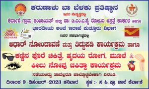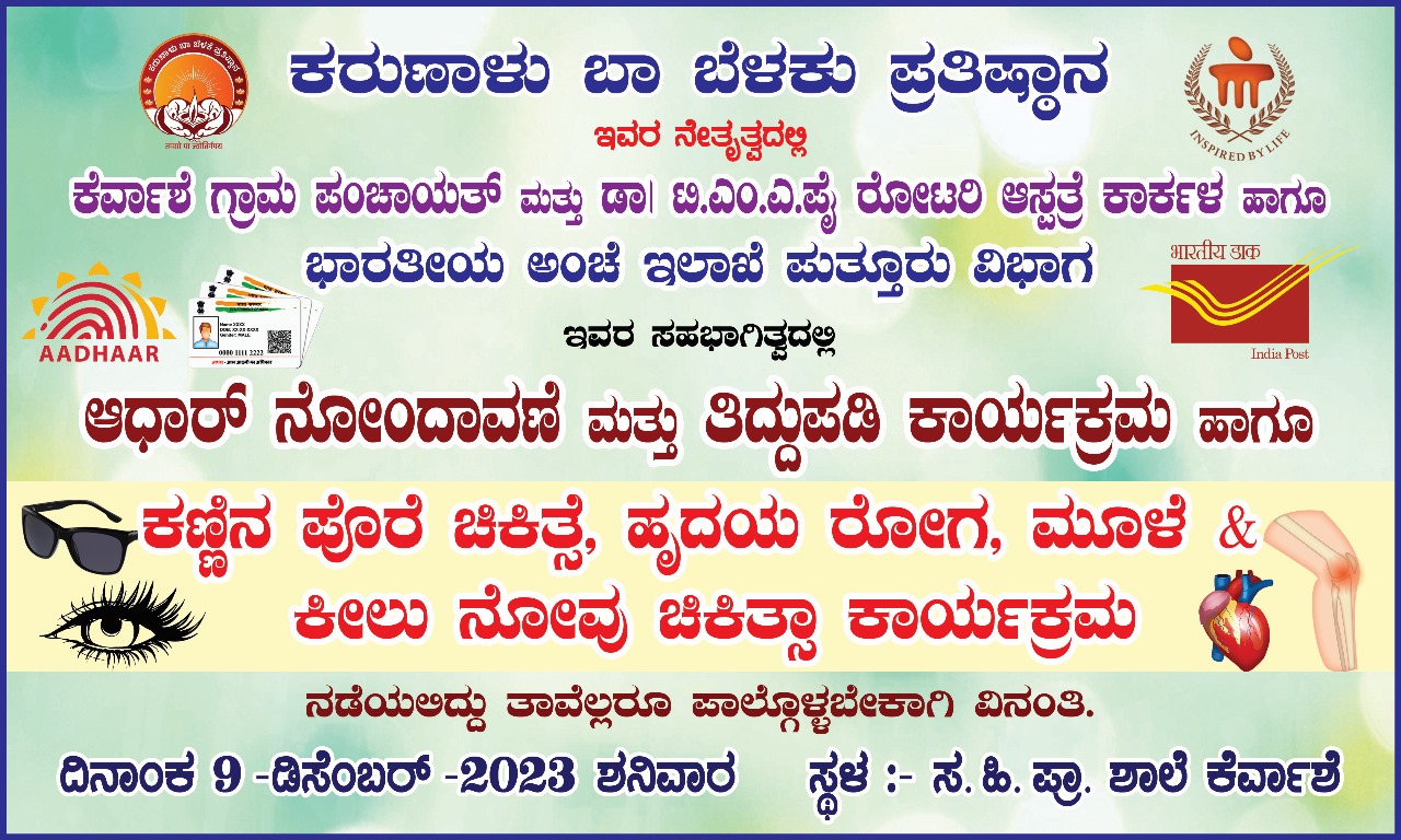 ಕಾರ್ಕಳ :ಡಿಸೆಂಬರ್ 08:ದ್ರಶ್ಯ ನ್ಯೂಸ್ : ಕರುನಾಳು ಬಾ ಬೆಳಕು ಪ್ರತಿಷ್ಠಾನ ಇವರ ನೇತೃತ್ವದಲ್ಲಿ ಕೇರ್ವಷೆ ಗ್ರಾಮ ಪಂಚಾಯಿತ್ ಮತ್ತು ಡಾ. ಟಿ. ಎಂ. ಪೈ ರೋಟರಿ ಆಸ್ಪತ್ರೆ ಕಾರ್ಕಳ ಹಾಗೂ ಭಾರತೀಯ ಅಂಚೆ ಇಲಾಖೆ ಪುತ್ತೂರು ವಿಭಾಗ ಇವರ ಸಹಭಾಗಿತ್ವದಲ್ಲಿ ಆಧಾರ್ ನೋಂದಾವಣೆ ಮತ್ತು ತಿದ್ದುಪಡಿ ಕಾರ್ಯಕ್ರಮ ಹಾಗೂ ಕಣ್ಣಿನ ಪೊರೆ ಚಿಕಿತ್ಸೆ, ಹೃದಯ ರೋಗ, ಮೂಳೆ- ಕೀಳು ನೋವು ಚಿಕಿತ್ಸೆ ಕಾರ್ಯಕ್ರಮವು ಇದೇ ದಿನಾಂಕ ಡಿಸೆಂಬರ್ 9 2023 ಶನಿವಾರ ಕೇರ್ವಷೆ ಸರಕಾರಿ ಹಿರಿಯ ಪ್ರಾಥಮಿಕ ಶಾಲೆಯಲ್ಲಿ ನಡೆಯಲಿದೆ .