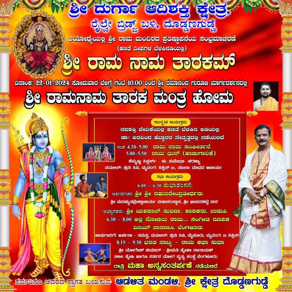 ಉಡುಪಿ : ಜನವರಿ 19:ದ್ರಶ್ಯ ನ್ಯೂಸ್ :ಉಡುಪಿ ದೊಡ್ಡಣ್ಣ ಗುಡ್ಡೆಯ ಶ್ರೀಚಕ್ರ ಪೀಠ ಸುರಪೂಜಿತೆ ಶ್ರೀ ದುರ್ಗಾ ಆದಿಶಕ್ತಿ ಕಾರಣಿಕ ಕ್ಷೇತ್ರದಲ್ಲಿಇದೇ ಜನವರಿ ತಿಂಗಳ 22ರ ಸೋಮವಾರದಂದು ಅಯೋಧ್ಯೆಯಲ್ಲಿ ಶ್ರೀರಾಮದೇವರ ಪ್ರಾಣ ಪ್ರತಿಷ್ಠೆಯ ಸಂಭ್ರಮಾಚರಣೆಯ ಪರ್ವಕಾಲದಲ್ಲಿ ಬೆಳಗ್ಗೆ ಕ್ಷೇತ್ರದಲ್ಲಿ ರಾಮನಾಮ ತಾರಕ ಮಂತ್ರ ಹೋಮವು ಕ್ಷೇತ್ರದ ಧರ್ಮದರ್ಶಿ ಶ್ರೀ ಶ್ರೀ ರಮಾನಂದ ಗುರೂಜಿ ಮಾರ್ಗದರ್ಶನದಲ್ಲಿ ವೇದಮೂರ್ತಿ ಕೃಷ್ಣಮೂರ್ತಿ ತಂತ್ರಗಳ ನೇತೃತ್ವದಲ್ಲಿ ನೆರವೇರಲಿರುವುದು.