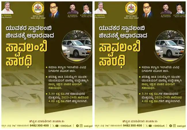 ಡಾ.ಬಿ.ಆರ್.ಅಂಬೇಡ್ಕರ್ ಅಭಿವೃದ್ಧಿ ನಿಗಮದ ವತಿಯಿಂದ ಸ್ವಾವಲಂಬಿ ಸಾರಥಿ ಯೋಜನೆಗಳಡಿ ಸರಕು ವಾಹನ ಅಥವಾ ಟ್ಯಾಕ್ಸಿ (ಹಳದಿ ಬೋರ್ಡ್) ಖರೀದಿಗೆ ಸಹಾಯಧನ ಹಾಗೂ ಸಾಲ ಸೌಲಭ್ಯವನ್ನು ನೀಡಲಾಗುತ್ತಿದ್ದು, ಇದೀಗ ಸಹಾಯಧನವನ್ನು 4 ಲಕ್ಷ ರೂ.ಗೆ ಹೆಚ್ಚಳ ಮಾಡಿ ಆದೇಶ ಹೊರಡಿಸಲಾಗಿದೆ