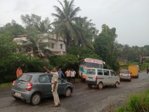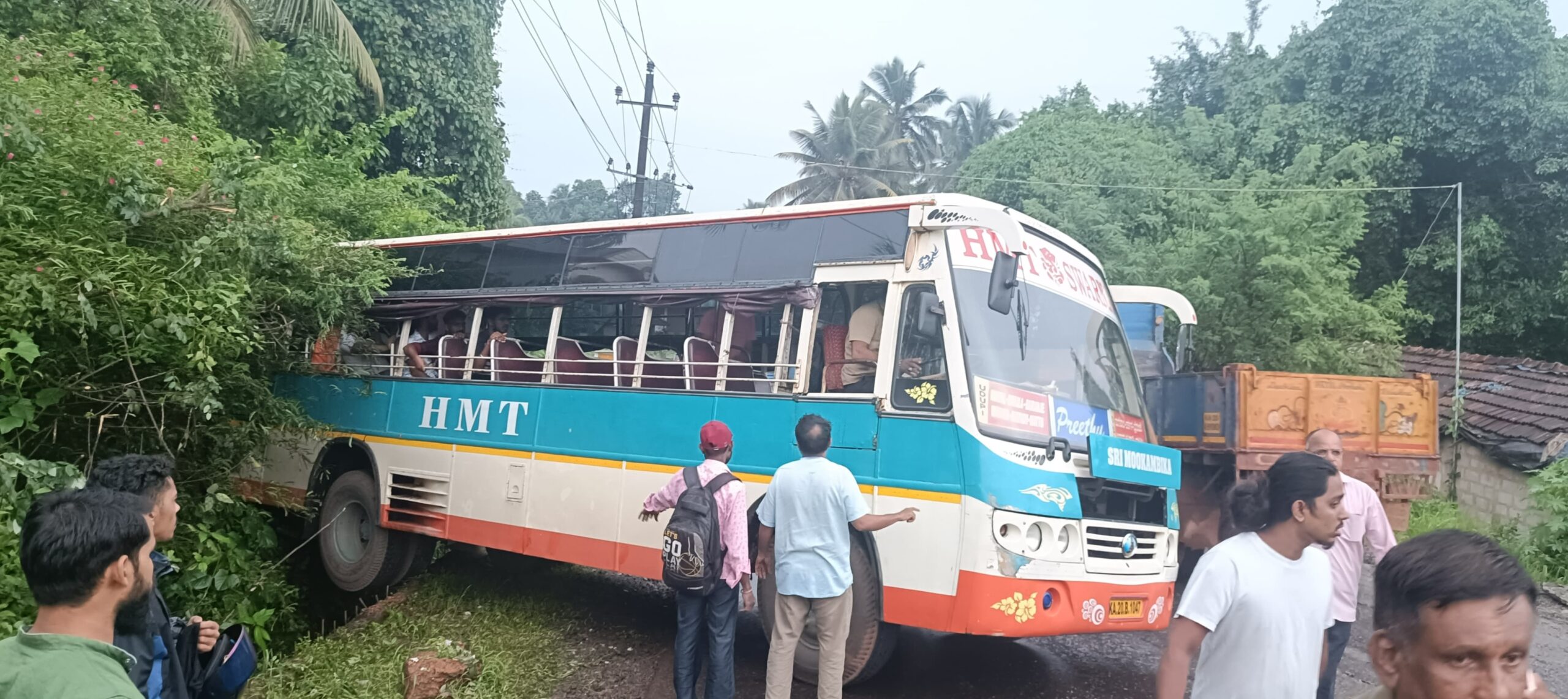 ಪರ್ಕಳ ಕೆನರಾ ಬ್ಯಾಂಕಿನ ಮುಂದೆ ತಿರುವಿನಲ್ಲಿ ಡಾಮರು ರಸ್ತೆಯಲ್ಲಿ ಉಡುಪಿಯಿಂದ ಬೈರಂಜೆ ಹೋಗುವ ಸಿಟಿ ಬಸ್ ಚಾಲಕನ ಸಮಯಪ್ರಜ್ಞೆಯಿಂದ ಪಕ್ಕಕ್ಕೆ ಹಿಂದಕ್ಕೆ ಸರಿದು ಬಲಭಾಗಕ್ಕೆ ಚಲಿಸಿ ಮೋರಿ ಬಳಿನಿಂತಿದೆ.
