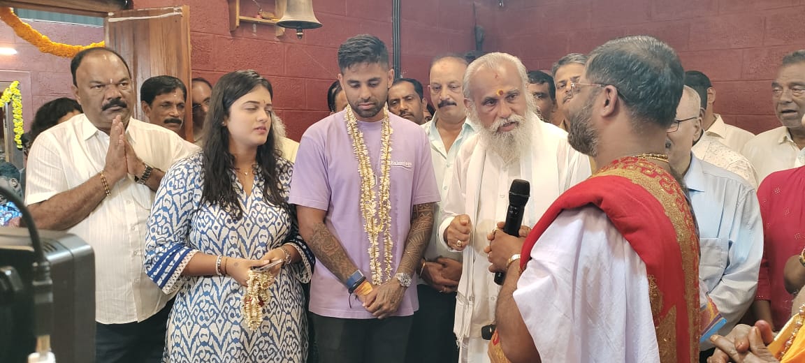 ನೂತನವಾಗಿ ನಿರ್ಮಾಣವಾಗುತ್ತಿರುವ ಕಾಪು ಶ್ರೀ ಹೊಸ ಮಾರಿಗುಡಿ ದೇವಸ್ಥಾನಕ್ಕೆ ಸೂರ್ಯಕುಮಾರ್ ದಂಪತಿ ಭೇಟಿ ನೀಡಿದರು. ದೇವಸ್ಥಾನದ ನಿರ್ಮಾಣ, ಕೆತ್ತನೆ ಶಿಲ್ಪಕಲೆಯ ಬಗ್ಗೆ ಕ್ರಿಕೆಟಿಗ ಮಾಹಿತಿ ಪಡೆದುಕೊಂಡರು.