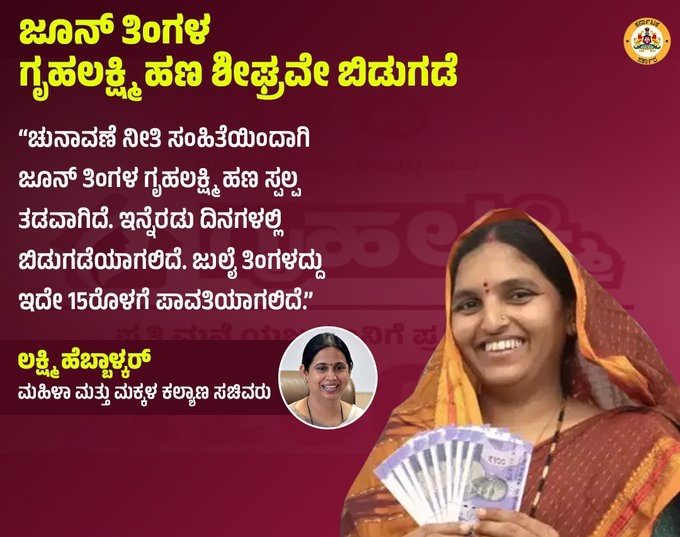 ಚುನಾವಣೆ ನೀತಿ ಸಂಹಿತೆಯಿಂದಾಗಿ ಜೂನ್ ತಿಂಗಳ ಗೃಹಲಕ್ಷ್ಮಿ ಹಣ ಸ್ಪಲ್ಪ ತಡವಾಗಿದೆ. ಇನ್ನೆರಡು ದಿನಗಳಲ್ಲಿ ಬಿಡುಗಡೆಯಾಗಲಿದೆ. ಜುಲೈ ತಿಂಗಳದ್ದು ಇದೇ 15ರೊಳಗೆ ಪಾವತಿಯಾಗಲಿದೆ ಎಂದು ಇಲಾಖೆ ತಿಳಿಸಿದೆ.