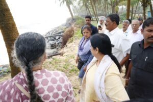 ಉಡುಪಿ : ಜುಲೈ 21:ಮಹಿಳಾ ಮತ್ತು ಮಕ್ಕಳ ಅಭಿವೃದ್ಧಿ ಇಲಾಖೆಯ ಸಚಿವರು ಹಾಗೂ ಉಡುಪಿ ಜಿಲ್ಲಾ ಉಸ್ತುವಾರಿ ಸಚಿವರಾದ ಲಕ್ಷ್ಮೀ ಹೆಬ್ಬಾಳಕರ್ ಅವರು, ಉಡುಪಿಯ ಪಡು ತೋಣ್ಸೆ ಗ್ರಾಮ ಪಂಚಾಯತ್ ವ್ಯಾಪ್ತಿಯ ಗುಜ್ಜರಬೆಟ್ಟು (ಹೂಡೆ) ಗ್ರಾಮಕ್ಕೆ ಭೇಟಿ ನೀಡಿ, ಕಡಲ ಕೊರತದಿಂದ ಹಾನಿಗೊಳಗಾದ ಪ್ರದೇಶವನ್ನು ವೀಕ್ಷಣೆ ಮಾಡಿದರು.