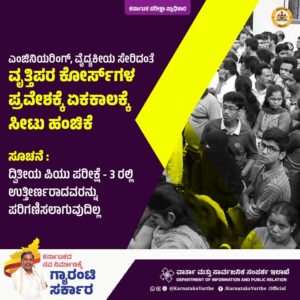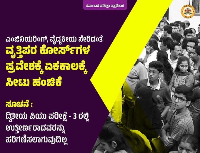 ಇದಲ್ಲದೇ ದ್ವಿತೀಯ ಪಿಯುಸಿ ಪರೀಕ್ಷೆ-3ರಲ್ಲಿ ಉತ್ತೀರ್ಣರಾದವರಿಗೆ, ಎಂಜಿನಯರಿಂಗ್ , ವೈದ್ಯಕೀಯ ಸೇರಿದಂತೆ ವೃತ್ತಿಪರ ಕೋರ್ಸ್ ಗಳ ಪ್ರವೇಶಕ್ಕೆ ಸೀಟು ಹಂಚಿಕೆಯಲ್ಲಿ ಪರಿಗಣಿಸಲಾಗುವುದಿಲ್ಲ ಅಂತ ಸ್ಪಷ್ಟ ಪಡಿಸಿದೆ