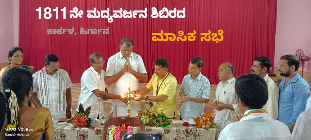 ಕಾರ್ಕಳ :ಆಗಸ್ಟ್ 04 :ಕಾರ್ಕಳ ತಾಲೂಕಿನ 1811ನೇ ಮದ್ಯ ವರ್ಜನ ಶಿಬಿರದ ಪಾನಮುಕ್ತ ನವಜೀವನ ಸದಸ್ಯರ ಮಾಸಿಕ ಸಭೆ ಹಿರ್ಗಾನ ಶ್ರೀ ಅಧಿಶಕ್ತಿ ಮಹಾಲಕ್ಷ್ಮಿ ದೇವಸ್ಥಾನದ ಸಭಾಂಗಣದಲ್ಲಿ ಸಮಿತಿಯ ಗೌರವಾಧ್ಯಕ್ಷರಾದ ಅಶೋಕ್ ನಾಯಕ್ ರವರ ಅಧ್ಯಕ್ಷತೆಯಲ್ಲಿ ನಡೆಯಿತು.
