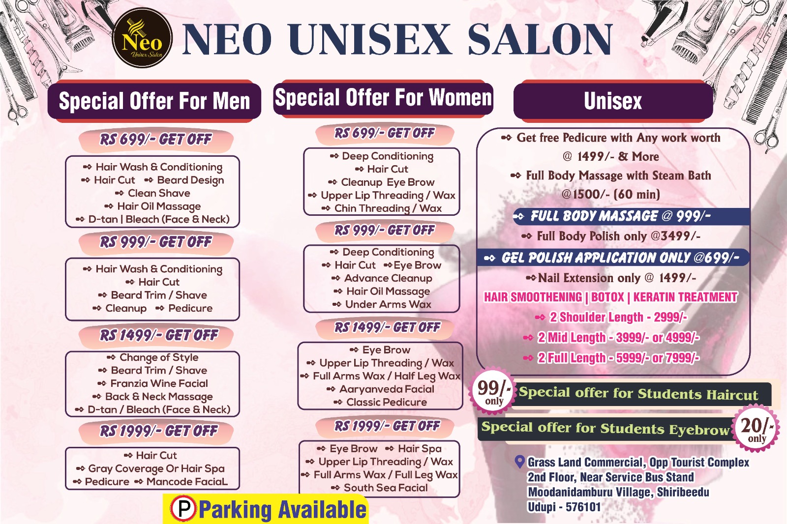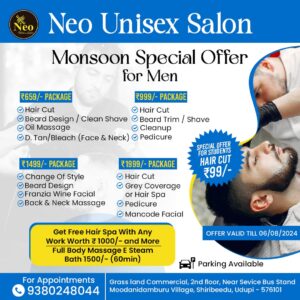 ಚಿಂತೆ ಬಿಡಿ ಇದೀಗ ಉಡುಪಿಯ “ನಿಯೋ ಯುನಿಸೆಕ್ಸ್ ಸಲೂನ್ “ಗ್ರಾಹಕರಿಗಾಗಿ ಒಂದೇ ಸೂರಿನಡಿ ಪುರುಷರಿಗೆ ಮತ್ತು ಮಹಿಳೆಯರಿಗಾಗಿ ವಿಶೇಷ ರಿಯಾಯಿತಿ ದರದಲ್ಲಿ ವಿವಿಧ ಆಫರ್ಸ್ ಗಳನ್ನು ಹಮ್ಮಿಕೊಂಡಿದೆ
