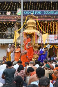 ಉಡುಪಿ : ಆಗಸ್ಟ್ 22:ಉಡುಪಿಯ ರಥ ಬೀದಿಯಲ್ಲಿರುವ ಶ್ರೀ ಮಂತ್ರಾಲಯ ಮಠದ ಶಾಖಮಠವಾದ ರಾಘವೇಂದ್ರ ಸ್ವಾಮಿಗಳ ಸನ್ನಿಧಿಯಲ್ಲಿ ಪರ್ಯಾಯ ಶ್ರೀ ಪುತ್ತಿಗೆ ಶ್ರೀಪಾದದ್ವಯರ ಉಪಸ್ಥಿತಿಯಲ್ಲಿ ರಾಘವೇಂದ್ರ ಸ್ವಾಮಿಗಳ ಆರಾಧನೆಯು ವೈಭವದಿಂದ ಜರುಗಿತು. ಮಧ್ಯಾಹ್ನದ ಮಹಾಪೂಜೆ ಹಾಗೂ ಪಲ್ಲ ಪೂಜೆಗಳನ್ನು ಪುತ್ತಿಗೆ ಶ್ರೀಗಳು ನರವೇರಿಸಿದರು ಸಂಜೆ ಶ್ರೀ ಕೃಷ್ಣನ ಸುವರ್ಣ ರಥದಲ್ಲಿ ರಾಘವೇಂದ್ರ ಸ್ವಾಮಿಗಳ ಪೂರ್ವ ಅವತಾರರಾದ ಪ್ರಹ್ಲಾದ ರಾಜರ ಉತ್ಸವ ಮೂರ್ತಿಯನ್ನು ರಥೋತ್ಸವ ನಡೆಸಿ ಶ್ರೀ ಕೃಷ್ಣನ ಸನ್ನಿಧಿಯ ಮುಂಭಾಗದಲ್ಲಿ ಚಂದ್ರ ಶಾಲೆಯಲ್ಲಿ ವೈಭವದ ಪೂಜೆಗಳನ್ನು ನಡೆಸಲಾಯಿತು ಪರ್ಯಾಯ ಉಭಯ ಶ್ರೀಪಾದರು ಭಂಡಾರಕೆರೆ ಶ್ರೀಗಳು ಉಪಸ್ಥಿತರಿದ್ದರು ರಾಘವೇಂದ್ರ ಸ್ವಾಮಿಗಳು ಉಡುಪಿಯ ಶ್ರೀ ಕೃಷ್ಣನ ಈ ಸನ್ನಿಧಿಯಲ್ಲಿ ಮಂತ್ರಾಲಯ ಮಠದಲ್ಲಿ 10 ವರ್ಷಗಳಿಗೂ ಹೆಚ್ಚು ಕಾಲ ಇದ್ದು ಶ್ರೀಕೃಷ್ಣನ ಉಪಾಸನೆ ಮಾಡುತ್ತಾ ಚಂದ್ರಿಕಾಪ್ರಕಾಶ ವೆಂಬ ಉದ್ಗ್ರಂಥ ವನ್ನು ರಚಿಸಿದ್ದರು.
