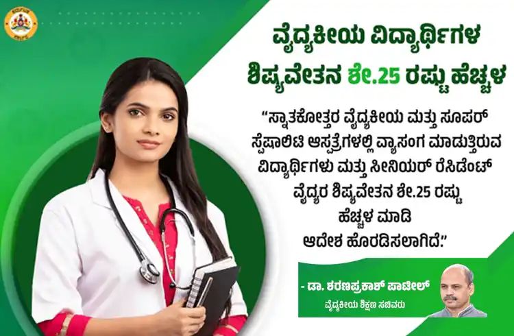 ಈ ಕುರಿತಂತೆ ಮಾಹಿತಿ ನೀಡಿರುವಂತ ವೈದ್ಯಕೀಯ ಶಿಕ್ಷಣ ಸಚಿವ ಡಾ.ಶರಣಪ್ರಕಾಶ್ ಪಾಟೀಲ್ ಅವರು, ಸ್ನಾತಕೋತ್ತರ ವೈದ್ಯಕೀಯ ಮತ್ತು ಸೂಪರ್ ಸ್ಪೆಷಾಲಿಟಿ ಆಸ್ಪತ್ರೆಗಳಲ್ಲಿ ವ್ಯಾಸಂಗ ಮಾಡುತ್ತಿರುವ ವಿದ್ಯಾರ್ಥಿಗಳು ಮತ್ತು ಸೀನಿಯರ್ ರೆಸಿಡೆಂಟ್ ವೈದ್ಯರ ಶಿಷ್ಯವೇತನ ಶೇ.25 ರಷ್ಟು ಹೆಚ್ಚಳ ಮಾಡಿ ಆದೇಶ ಹೊರಡಿಸಲಾಗಿದೆ ಎಂದು ತಿಳಿಸಿದ್ದಾರೆ.