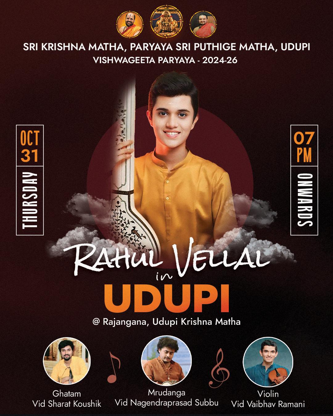ದೇಶಾದ್ಯಂತ ವಿವಿಧ ಕಡೆ ಕಚೇರಿ ನೀಡಿರುವ ರಾಹುಲ್ ವೆಲ್ಲಾಲ್ ಅವರಿಗೆ ಘಟಂನಲ್ಲಿ ಶರತ್ ಕೌಶಿಕ್, ಮೃದಂಗದಲ್ಲಿ ನಾಗೇಂದ್ರ ಪ್ರಸಾದ್ ಸುಬ್ಬು, ವಯೋಲಿನ್ ನಲ್ಲಿ ವೈಭವ್ ರಮಣಿ ಅವರು ಸಹಕರಿಸಲಿದ್ದಾರೆ