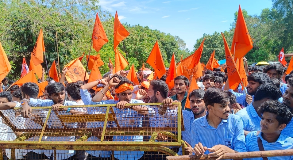 ಉಡುಪಿ, ದಕ್ಷಿಣ ಕನ್ನಡ ಸಹಿತ ಮಂಗಳೂರು ವಿವಿ ವ್ಯಾಪ್ತಿಯ ಕಾಲೇಜುಗಳ ಸಹಸ್ರಾರು ವಿದ್ಯಾರ್ಥಿಗಳು ಮಂಗಳಗಂಗೋತ್ರಿ ಕ್ಯಾಂಪಸ್ಗೆ ವಿಶೇಷ ಬಸ್ಗಳಲ್ಲಿ ಆಗಮಿಸಿ ಆಡಳಿತ ಸೌಧದ ವರೆಗೆ ಮೆರವಣಿಗೆಯಲ್ಲಿ ತೆರಳಿದರು. ಪೊಲೀಸರು ಆಡಳಿತ ಸೌಧದ ಪಾರ್ಕಿಂಗ್ ಪ್ರದೇಶದಲ್ಲೇ ಬ್ಯಾರಿಕೇಡ್ ಹಾಕಿ ವಿದ್ಯಾರ್ಥಿಗಳನ್ನು ತಡೆದಿದ್ದು, ಏಕಾಏಕಿ ವಿದ್ಯಾರ್ಥಿಗಳ ಒಂದು ತಂಡ ಬ್ಯಾರಿಕೇಡ್ ತಪ್ಪಿಸಿ ನೇರವಾಗಿ ಆಡಳಿತ ಸೌಧದ ಒಳಗೆ ಪ್ರವೇಶಿಸಲು ಯತ್ನಿಸಿದ್ದಾರೆ.