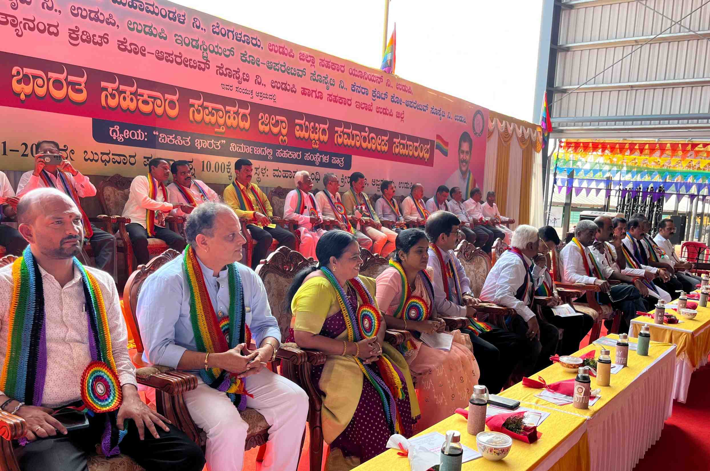 ಉಡುಪಿ : ನವೆಂಬರ್ 20:ಕರ್ನಾಟಕ ರಾಜ್ಯ ಸಹಕಾರ ಮಹಾಮಂಡಳ ನಿ. ಬೆಂಗಳೂರು ಹಾಗೂ ಉಡುಪಿ ಜಿಲ್ಲಾ ಸಹಕಾರಿ ಯೂನಿಯನ್ ನಿ. ಉಡುಪಿ, ಸಹಕಾರ ಇಲಾಖೆ ಉಡುಪಿ ಜಿಲ್ಲೆ ಹಾಗೂ ವಿವಿಧ ಸಹಕಾರಿ ಸಂಸ್ಥೆಗಳ ಸಂಯುಕ್ತ ಆಶ್ರಯದಲ್ಲಿ ಆಯೋಜಿಸಿದ್ದ 71ನೇ ಅಖಿಲ ಭಾರತ ಸಹಕಾರ ಸಪ್ತಾಹದ ಬೆಳಿಗ್ಗೆ 10ಗಂಟೆಗೆ ಅಜ್ಜರಕಾಡಿನ ಮಹಾತ್ಮಗಾಂಧಿ ಜಿಲ್ಲಾ ಕ್ರೀಡಾಂಗಣದಲ್ಲಿ ‘ಉತ್ತಮ ವಿಶ್ವ ನಿರ್ಮಾಣ ಹಾದಿಗಾಗಿ’ ವಿಷಯದ ಕುರಿತ ಏಳನೇ ದಿನದ ಕಾರ್ಯಕ್ರಮ ಹಾಗೂ ಸಪ್ತಾಹದ ಸಮಾರೋಪ ಸಮಾರಂಭ ಜರುಗಿತು . ಕರ್ನಾಟಕ ರಾಜ್ಯ ಸಹಕಾರ ಮಹಾಮಂಡಳ ಹಾಗೂ ದ.ಕ ಜಿಲ್ಲಾ ಕೇಂದ್ರ ಸಹಕಾರಿ ಬ್ಯಾಂಕ್ ನ ಅಧ್ಯಕ್ಷ ಡಾ. ಎಂ.ಎನ್. ರಾಜೇಂದ್ರ ಕುಮಾರ್ ಉದ್ಘಾಟಿಸಿದರು