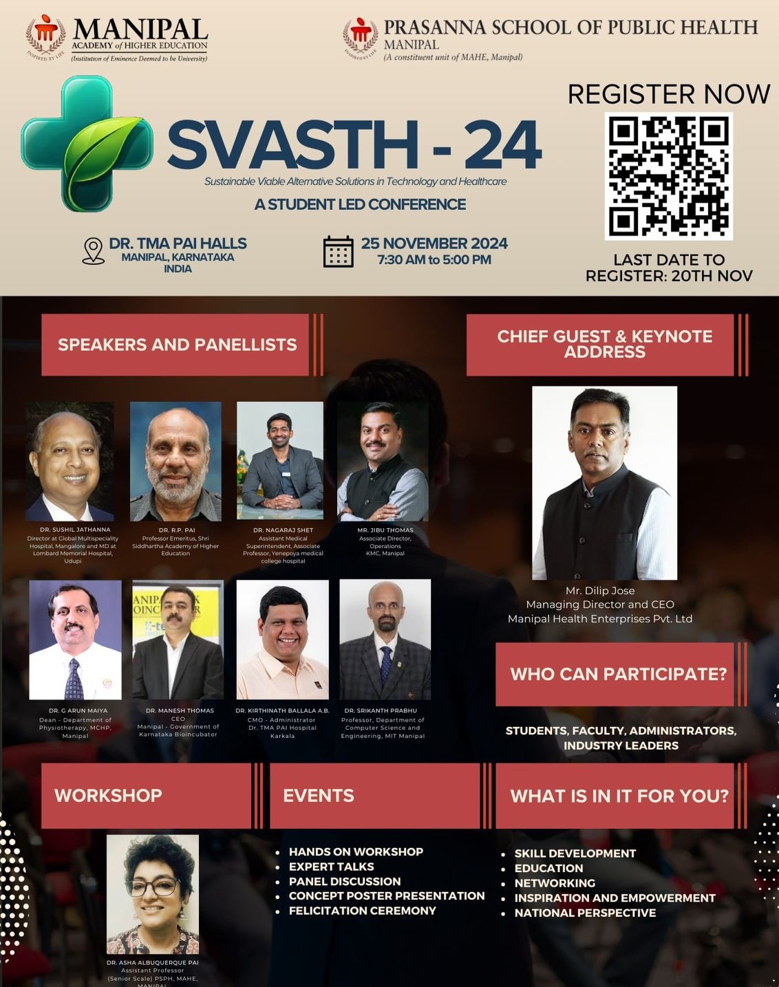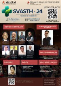 ನವೆಂಬರ್ 23, 2024, ಮಣಿಪಾಲ: ಮಣಿಪಾಲ್ ಅಕಾಡೆಮಿ ಆಫ್ ಹೈಯರ್ ಎಜುಕೇಶನ್ (MAHE)ನ ಘಟಕ ಸಂಸ್ಥೆಯಾದ ,ಪ್ರಸನ್ನ ಸ್ಕೂಲ್ ಆಫ್ ಪಬ್ಲಿಕ್ ಹೆಲ್ತ್ (PSPH), ಆರೋಗ್ಯ ರಕ್ಷಣೆ ತಂತ್ರಜ್ಞಾನದ ಭವಿಷ್ಯಕ್ಕಾಗಿ ಮೀಸಲಾಗಿರುವ ಹೆಚ್ಚು ನಿರೀಕ್ಷಿತ, ವಿದ್ಯಾರ್ಥಿ-ಚಾಲಿತ ಸಮ್ಮೇಳನವಾದ ಸ್ವಸ್ಥ್ -24 ಅನ್ನು ಘೋಷಿಸಲು ಹೆಮ್ಮೆಪಡುತ್ತದೆ. ಸಮ್ಮೇಳನವು ನವೆಂಬರ್ 25, 2024 ರಂದು ಮಣಿಪಾಲದ ಡಾ. ಟಿ ಎಂ ಎ ಪೈ ಹಾಲ್ಸ್ನಲ್ಲಿ ನಡೆಯಲಿದೆ ಮತ್ತು ಆರೋಗ್ಯ ರಕ್ಷಣೆಯ ಭವಿಷ್ಯವನ್ನು ರೂಪಿಸುವ ನವೀನ ಪರಿಹಾರಗಳತ್ತ ತೊಡಗಿಸಿಕೊಳ್ಳುವ ಭರವಸೆ ನೀಡುತ್ತದೆ.