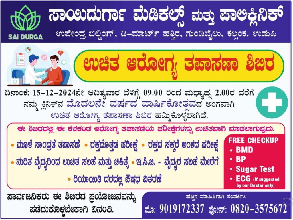 ಉಡುಪಿ :ಡಿಸೆಂಬರ್ 13: ಸಾಯಿದುರ್ಗಾ ಮೆಡಿಕಲ್ಸ್ ಮತ್ತು ಪಾಲಿಕ್ಲಿನಿಕ್ ನ ಮೊದಲನೇ ವರ್ಷದ ವಾರ್ಷಿಕೋತ್ಸವದ ಅಂಗವಾಗಿ ಡಿಸೆಂಬರ್ 15ರಂದು ಆದಿತ್ಯವಾರ ಬೆಳಿಗ್ಗೆ 09.00 ರಿಂದ ಮಧ್ಯಾಹ್ನ 2.00ರ ವರೆಗೆ ಸಾರ್ವಜನಿಕರಿಗಾಗಿ ಉಚಿತ ಆರೋಗ್ಯ ತಪಾಸಣಾ ಶಿಬಿರ ಹಮ್ಮಿಕೊಳ್ಳಲಾಗಿದೆ.