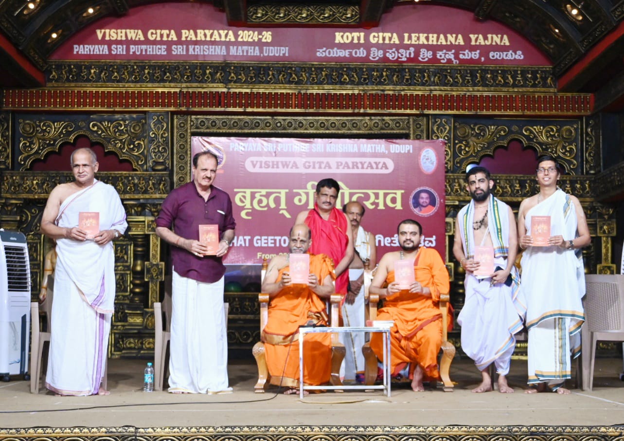 ಉಡುಪಿ: ಡಿಸೆಂಬರ್ 18:ಪರ್ಯಾಯ ಪುತ್ತಿಗೆ ಶ್ರೀಕೃಷ್ಣ ಮಠದಿಂದ ನಡೆಯುತ್ತಿರುವ ಬೃಹತ್ ಗೀತೋತ್ಸವ ಸಂದರ್ಭದಲ್ಲಿ ಪರ್ಯಾಯ ಮಠಾಧೀಶ ಪುತ್ತಿಗೆ ಶ್ರೀ ಸುಗುಣೇಂದ್ರತೀರ್ಥ ಶ್ರೀಪಾದರು ತಮ್ಮ ಗುರುಗಳಾದ ಶ್ರೀ ಸುಜ್ಞಾನೇಂದ್ರತೀರ್ಥ ಶ್ರೀಪಾದರು ಬರೆದ ಆಚಾರ್ಯ ಮಧ್ವರ ಗೀತಾ ಭಾಷ್ಯವನ್ನಾಧರಿಸಿ 1961ರಲ್ಲಿ ಪ್ರಕಟವಾಗಿದ್ದ ಅಪೂರ್ವ ಕೃತಿ ‘ಗೀತಾಮೃತಸಾರ’ದ ಮರುಮುದ್ರಿತ ಕೃತಿಯನ್ನು ಮಂಗಳವಾರ ಅನಾವರಣಗೊಳಿಸಿದರು.