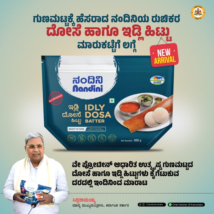 ಇಂದು ಮುಖ್ಯಮಂತ್ರಿ ಸಿದ್ಧರಾಮಯ್ಯ ಅವರು ನಂದಿನಿ ವತಿಯಿಂದ ಪ್ರಥಮ ಬಾರಿಗೆ ತಯಾರಿಸಿರುವ ನಂದಿನಿ ವೇ ಪ್ರೋಟಿನ್ ಆಧಾರಿತ ಇಡ್ಲಿ ಮತ್ತು ದೋಸೆ ಹಿಟ್ಟನ್ನು ಬಿಡುಗಡೆ ಮಾಡಿದರು.