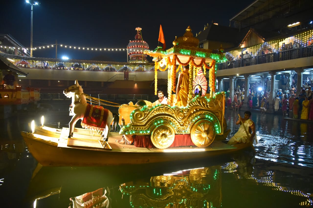 ಸಂಜೆಯ ಚಾಮರ ಸೇವೆ ಪೂಜೆಯ ಬಳಿಕ ಮೊದಲು ತೆಪ್ಪೋತ್ಸವ ನಡೆಯಿತು. ಈ ಬಾರಿ ತೆಪ್ಪವನ್ನು ಪಾರ್ಥಸಾರಥಿ ರೂಪದಲ್ಲಿ ಅಲಂಕರಿಸಲಾಗಿತ್ತು.