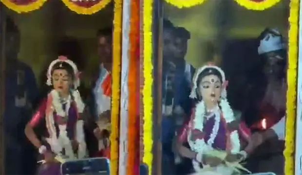 ಅಜೆಕಾರು: ಏಪ್ರಿಲ್ 05: ಶಿರ್ಲಾಲಿನ ಪಂಗ್ಲಬೆಟ್ಟು ಶ್ರೀ ಬ್ರಹ್ಮ ಮುಗೇರಕಲ ಕ್ಷೇತ್ರದ ತನ್ನಿಮಾನಿಗ ನೇಮದಲ್ಲಿ 6ನೇ ತರಗತಿಯ ವಿದ್ಯಾರ್ಥಿಯೊಬ್ಬ ಹೆಣ್ಣು ದೈವದ ಕೋಲಕ್ಕೆ ಬಣ್ಣ ಹಚ್ಚಿ ಗಮನ ಸೆಳೆದಿದ್ದಾನೆ.