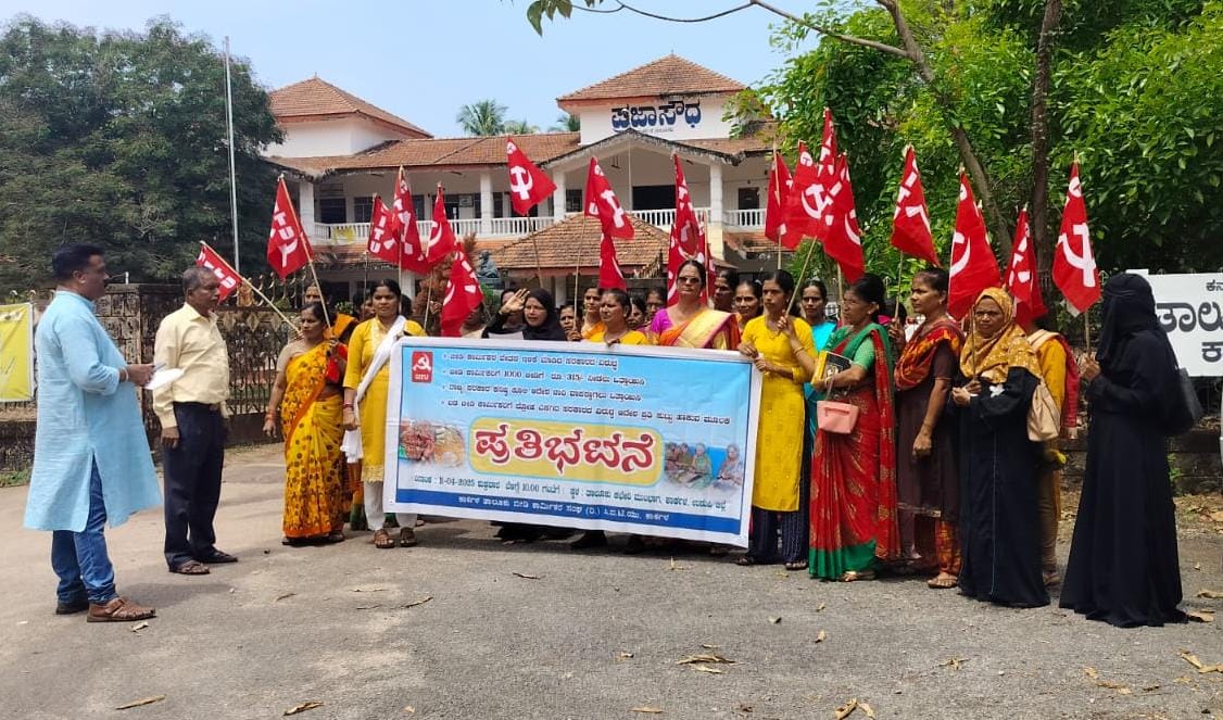 ಕಾರ್ಕಳ: ಏಪ್ರಿಲ್ 11:ಕನಿಷ್ಟ ಕೂಲಿ,ತುಟ್ಟಿಭತ್ಯೆ ಕಡಿತಗೊಳಿಸಿದ ಕರ್ನಾಟಕ ಸರಕಾರದ ಆದೇಶ ವಾಪಸಾತಿಗೆ ಒತ್ತಾಯಿಸಿ ಇಂದು ಕಾರ್ಕಳ ತಾಲೂಕು ಕಛೇರಿ ಮುಂದೆ ಆದೇಶ ಪ್ರತಿ ಸುಟ್ಟು ಪ್ರತಿಭಟನೆ ನಡೆಸಲಾಯಿತು. ನಂತರ ತಹಶಿಲ್ದಾರರ ಮುಖಾಂತರ ಮುಖ್ಯ ಮಂತ್ರಿ ಹಾಗೂ ಕಾರ್ಮಿಕ ಸಚಿವರಿಗೆ ಮನವಿ ನೀಡಲಾಯಿತು.