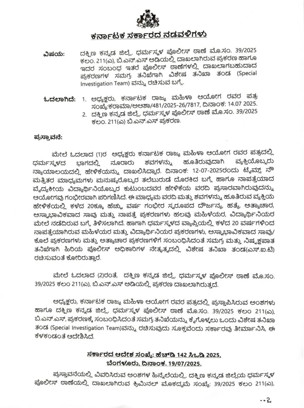 ಧರ್ಮಸ್ಥಳದ ಸುತ್ತಮುತ್ತಲು ಸಂಭವಿಸಿರುವ ಎನ್ನಲಾದ ಸಾವುಗಳ ಆರೋಪಗಳಿಗೆ ಸಂಬಂಧಿಸಿ ಕೂಲಂಕಷ ತನಿಖೆಗೆ ಎಸ್ಐಟಿ ರಚನೆ ಮಾಡುವಂತೆ ಇತ್ತೀಚೆಗೆ ಸಿಎಂ ಸಿದ್ದರಾಮಯ್ಯ ಅವರಿಗೆ ರಾಜ್ಯ ಮಹಿಳಾ ಆಯೋಗದ ಅಧ್ಯಕ್ಷೆ ಡಾ.ನಾಗಲಕ್ಷ್ಮೀ ಚೌಧರಿ ಅವರು ಪತ್ರ ಬರೆದಿದ್ದರು.