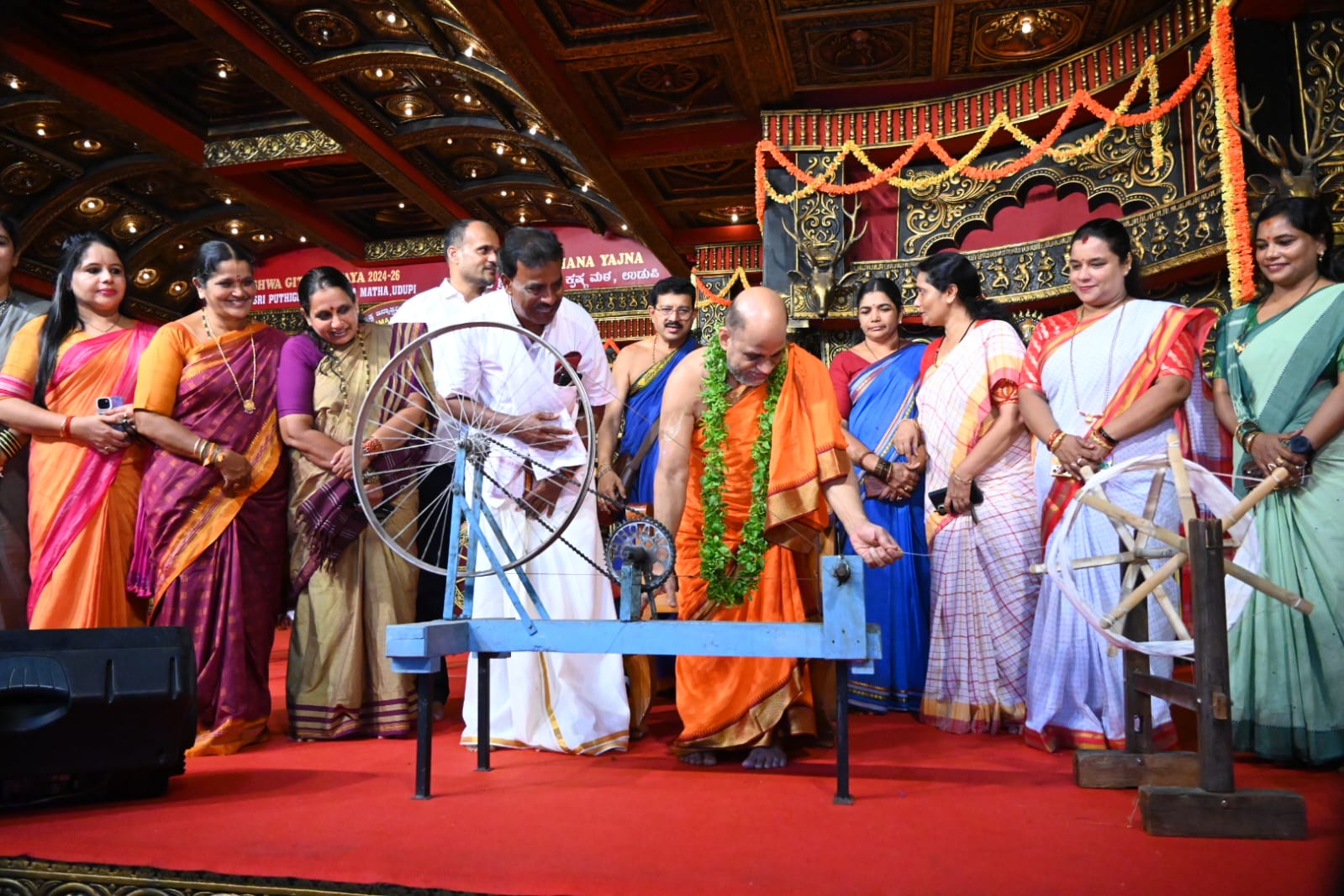 ಉಡುಪಿ: ಆಗಸ್ಟ್ 07:ಶ್ರೀ ಕೃಷ್ಣ ಮಠದ ರಾಜಾಂಗಣದಲ್ಲಿ ಉಡುಪಿ ಜಿಲ್ಲಾ ಬಿಜೆಪಿ ಮಹಿಳಾ ಮೋರ್ಚಾ,ಉಡುಪಿ ಜಿಲ್ಲಾ ಬಿಜೆಪಿ ನೇಕಾರರ ಪ್ರಕೋಸ್ಟ,ಉಡುಪಿ ಪದ್ಮಶಾಲಿ ನೇಕಾರ ಪ್ರತಿಷ್ಠಾನ, ವತಿಯಿಂದ ಸಾಂಪ್ರದಾಯಿಕ ಶೈಲಿಯಲ್ಲಿ ಕೈಮಗ್ಗ ಸೀರೆಗಳನ್ನು ಉಟ್ಟು ಸೌಂದರ್ಯ ಸ್ಪರ್ಧೆಯ ಉದ್ಘಾಟನೆಯನ್ನು ಪರ್ಯಾಯ ಶ್ರೀ ಪುತ್ತಿಗೆ ಶ್ರೀಪಾದರು ದೀಪಬೆಳಗಿಸಿ ಕೈಮಗ್ಗ ತಿರುಗಿಸುವ ಮೂಲಕ ಚಾಲನೆ ನೀಡಿ ಅನುಗ್ರಹ ಸಂದೇಶ ನೀಡಿದರು