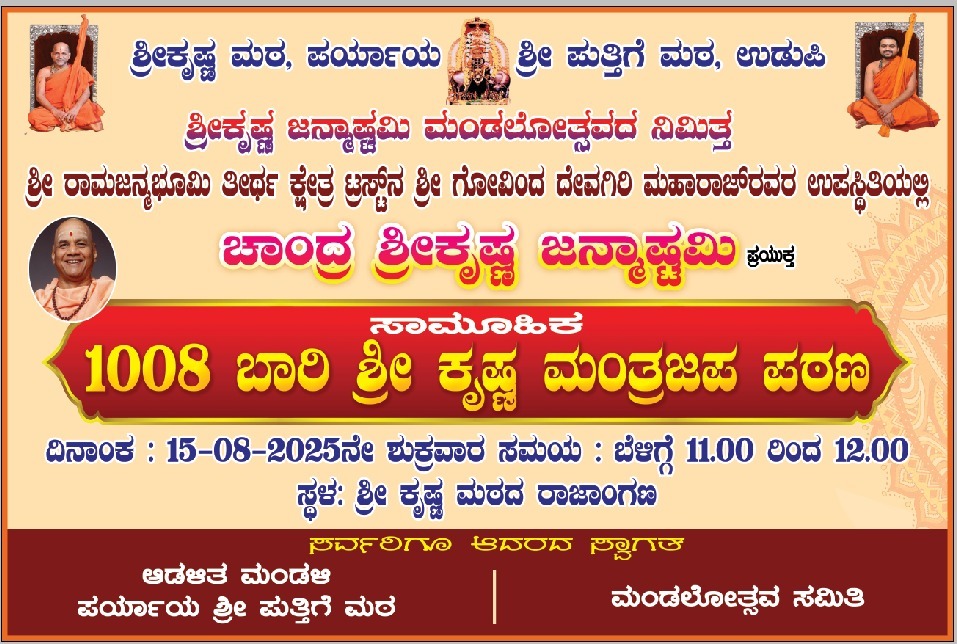 ಚಾಂದ್ರ ಶ್ರೀ ಕೃಷ್ಣ ಜನ್ಮಾಷ್ಟಮಿ ಪ್ರಯುಕ್ತ ಪರ್ಯಾಯ ಶ್ರೀ ಗಳವರು ಹಾಗೂ ಆಯೋದ್ಯೆ ರಾಮ ಮಂದಿರ ಟ್ರಸ್ಟ್ ನ ಶ್ರೀ ಗೋವಿಂದ ಗಿರಿದೇವ ಸ್ವಾಮೀಜಿ ಮಹಾರಾಜರ ಉಪಸ್ಥಿತಿಯಲ್ಲಿ ಆಗಸ್ಟ್ 15ರಂದು ಶ್ರೀ ಕೃಷ್ಣ ಮಠದ ರಾಜಾಂಗಣದಲ್ಲಿ ಬೆಳಿಗ್ಗೆ 11.15- 12.15 ಸಾಮೂಹಿಕ 1008 ಬಾರಿ ಶ್ರೀ ಕೃಷ್ಣ ಮಂತ್ರ ಜಪ ಪಠಣ ಹಾಗೂ ಭೋಜನ ಪ್ರಸಾದ ವಿತರಣೆ ನಡೆಯಲಿದ್ದು ಶ್ರೀ ಕೃಷ್ಣ ಭಕ್ತಾಭಿಮಾನಿಗಳು ಮನೆ ಮಂದಿ ಯೊಂದಿಗೆ ಸಾಂಪ್ರದಾಯಿಕ ಶೈಲಿಯ ವಸ್ತ್ರದಾರಣೆಯೊಂದಿಗೆ ಹಾಜರಾಗಲು ವಿನಂತಿ. ಪರ್ಯಾಯ ಪುತ್ತಿಗೆ ಮಠದ ಪ್ರಕಟಣೆ ತಿಳಿಸಿದೆ