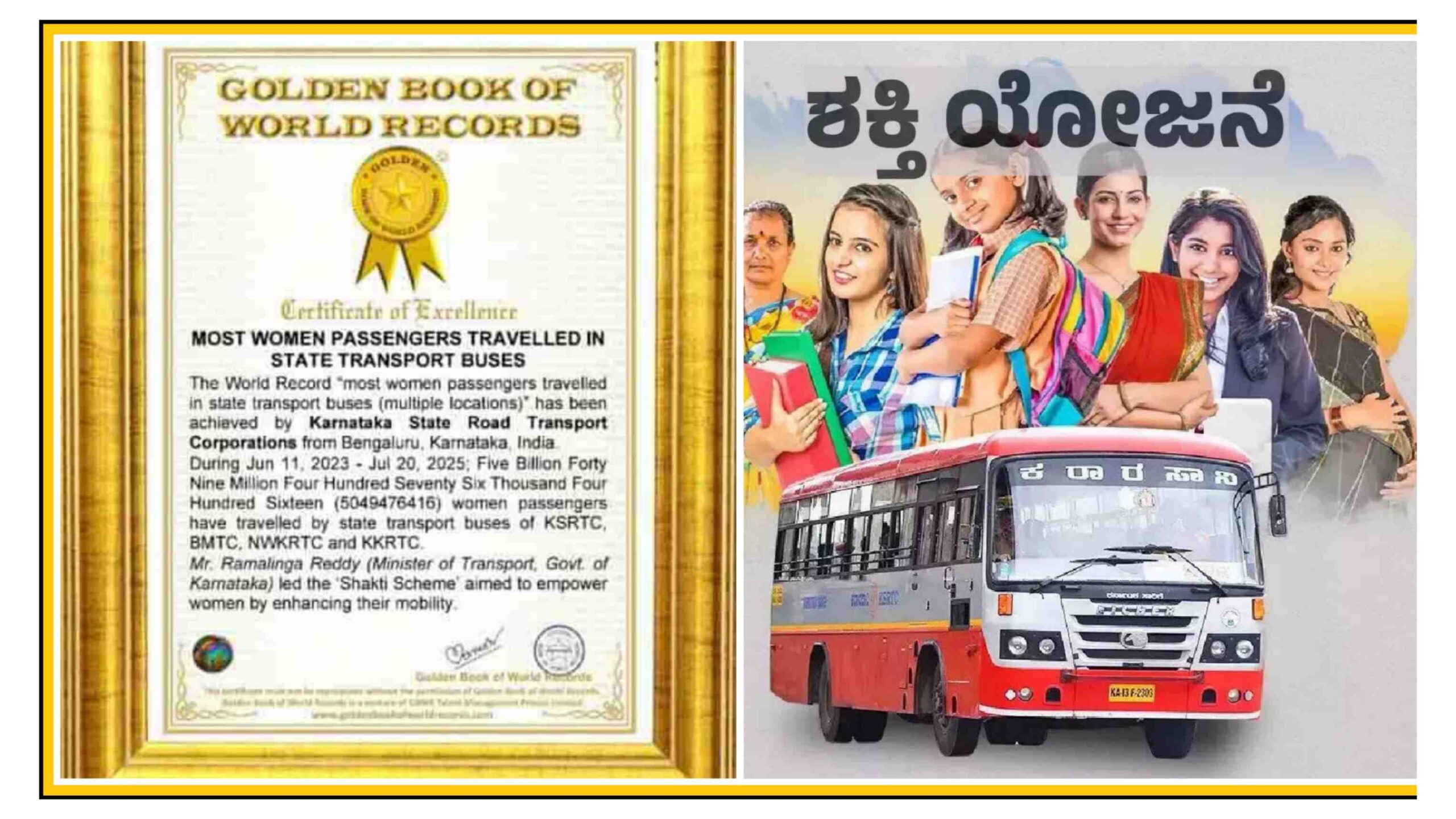 2023ರ ಜೂನ್ 11 ರಿಂದ 2025 ಜುಲೈ 25ರ ಅವಧಿಯಲ್ಲಿ ನಾಲ್ಕೂ ನಿಗಮದ ಸಾರಿಗೆ ಬಸ್ಗಳಲ್ಲಿ 5049476416 ಮಹಿಳೆಯರು (500 ಕೋಟಿ) ಉಚಿತ ಟಿಕೇಟ್ ಪಡೆದು ಪ್ರಯಾಣ ಮಾಡಿದ್ದಾರೆ. ಈ ಕಾರಣದಿಂದ ಶಕ್ತಿ ಯೋಜನೆ ಗೊಲ್ಡನ್ ಬುಕ್ ಆಫ್ ವರ್ಲ್ಡ್ ರೆಕಾರ್ಡ್ಸ್ನಲ್ಲಿ ಸ್ಥಾನ ಪಡೆದಿದೆ.