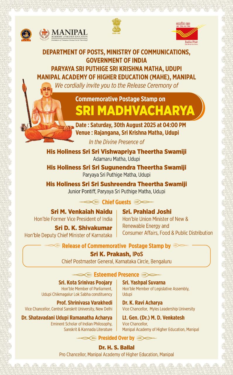 ಸಂವಹನ ಮತ್ತು ಭಾರತೀಯ ಅಂಚೆ ಇಲಾಖೆಯ ಈ ಸಮಾರಂಭದಲ್ಲಿ ಅದಮಾರು ಶ್ರೀ ಶ್ರೀ ವಿಶ್ವಪ್ರಿಯ ತೀರ್ಥ ರು ಹಾಗೂ ಪರ್ಯಾಯ ಶ್ರೀ ಪುತ್ತಿಗೆ ಶ್ರೀಗಳ ಆಶೀರ್ವಾದ ದೊಂದಿಗೆ ಮಾನ್ಯ ಉಪ ಮುಖ್ಯ ಮಂತ್ರಿ ಶ್ರೀ ಡಿ ಕೆ ಶಿವಕುಮಾರ್ ರವರ ಘನ ಉಪಸ್ಥಿತಿಯಲ್ಲಿ ಮಣಿಪಾಲ ಅಕಾಡೆಮಿ ಆಫ್ ಹೈಯರ್ ಎಜುಕೇಶನ್ ( ಮಾಹೆ )ನ ಪ್ರಾಯೋಜಕತ್ವ ದಲ್ಲಿ ಗಣ್ಯ ರ ಉಪಸ್ಥಿತಿಯಲ್ಲಿ ಕರ್ನಾಟಕ ವೃತ್ತದ ಮುಖ್ಯ ಪೋಸ್ಟಮಾಸ್ಟರ್ ಜನರಲ್ ಶ್ರೀ ಕೆ ಪ್ರಕಾಶ್ ರವರು ಆಗಸ್ಟ್ 30 ರ ಸಂಜೆ ನಾಲ್ಕು ಗಂಟೆಗೆ ಬಿಡುಗಡೆ ಗೊಳಿಸಲಿದ್ದಾರೆ