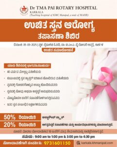 ಕಾರ್ಕಳ 03 : ಸೆಪ್ಟೆಂಬರ್ 2025:ಸ್ತನ ಕ್ಯಾನ್ಸರ್ ಮಹಿಳೆಯರ ಪ್ರಮುಖ ಆರೋಗ್ಯ ಸಮಸ್ಯೆ ಹಾಗೂ ಕಾಳಜಿಗಳಲ್ಲಿ ಒಂದಾಗಿ ಮುಂದುವರೆದಿದೆ, ಆದರೆ ಸಮಯಕ್ಕೆ ಸರಿಯಾಗಿ ಪತ್ತೆಹಚ್ಚುವುದು ಮತ್ತು ಸರಿಯಾದ ಅರಿವು ಮುಖ್ಯವಾಗಿದೆ. ಈ ಉದ್ದೇಶವನ್ನು ಬಲಪಡಿಸಲು, ಡಾ. ಟಿಎಂಎ ಪೈ ರೋಟರಿ ಆಸ್ಪತ್ರೆ, ಕಾರ್ಕಳ ಸೆಪ್ಟೆಂಬರ್ 5, 2025 ರಂದು ಉಚಿತ ಸ್ತನ ಆರೋಗ್ಯ ತಪಾಸಣಾ ಶಿಬಿರವನ್ನು ಬೆಳಿಗ್ಗೆ 9:00 ರಿಂದ ಮಧ್ಯಾಹ್ನ 1:00 ರವರೆಗೆ ಮತ್ತು ಮಧ್ಯಾಹ್ನ 3:00 ರಿಂದ ಸಂಜೆ 4:30 ರವರೆಗೆ ಆಯೋಜಿಸಿತ್ತಿದೆ.