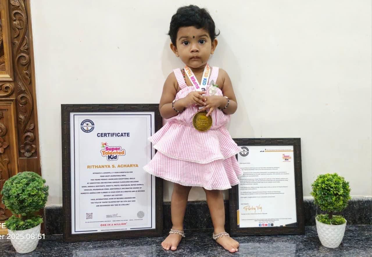 ಉಡುಪಿ:ಸೆಪ್ಟೆಂಬರ್ 17:ಉಡುಪಿ ಜಿಲ್ಲೆಯ ಕಮಲಶಿಲೆ ನಿವಾಸಿ ಸುಧಾಕರ ಆಚಾರ್ಯ ಹಾಗೂ ಸುಚೇತಾ ದಂಪತಿಯ ಮಗಳು ರಿತನ್ಯ ಎಸ್. ಆಚಾರ್ಯ (1 ವರ್ಷ 4 ತಿಂಗಳು) ತನ್ನ ಅಪರೂಪದ ಪ್ರತಿಭೆಯಿಂದ ಇಂಟರ್ನ್ಯಾಷನಲ್ ಬುಕ್ ಆಫ್ ರೆಕಾರ್ಡ್ಸ್ ವತಿಯಿಂದ “ಸೂಪರ್ ಟ್ಯಾಲೆಂಟೆಡ್ ಕಿಡ್” ಎಂಬ ಬಿರುದನ್ನು ಪಡೆದು “ಒನ್ ಇನ್ ಎ ಮಿಲಿಯನ್” ಗೌರವವನ್ನು ಪಡೆದಿದ್ದಾಳೆ.