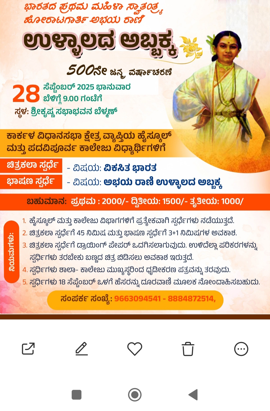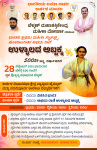 ಕಾರ್ಕಳ :ಸೆಪ್ಟೆಂಬರ್ 26:ಭಾರತೀಯ ಜನತಾ ಪಾರ್ಟಿ ಕಾರ್ಕಳ ಮಂಡಲ ಬೆಳ್ಮಣ್ ಮಹಾಶಕ್ತಿಕೇಂದ್ರ ಮಹಿಳಾ ಮೋರ್ಚಾ ವತಿಯಿಂದ ಭಾರತದ ಪ್ರಥಮ ಮಹಿಳಾ ಸ್ವಾತಂತ್ರ್ಯ ಹೋರಾಟಗಾರ್ತಿ ಅಭಯ ರಾಣಿ ಉಳ್ಳಾಲದ ಅಬ್ಬಕ್ಕ 500ನೇ ಜನ್ಮ ವರ್ಷಾಚರಣೆ ಯನ್ನು 28 ಸೆಪ್ಟೆಂಬರ್ 2025 ಭಾನುವಾರ ಬೆಳಿಗ್ಗೆ 9.00 ಗಂಟೆಗೆ ಸ್ಥಳ: ಶ್ರೀಕೃಷ್ಣ ಸಭಾಭವನ ಬೆಳ್ಮಣ್ ನಲ್ಲಿ ಆಯೋಜಿಸಲಾಗಿದೆ