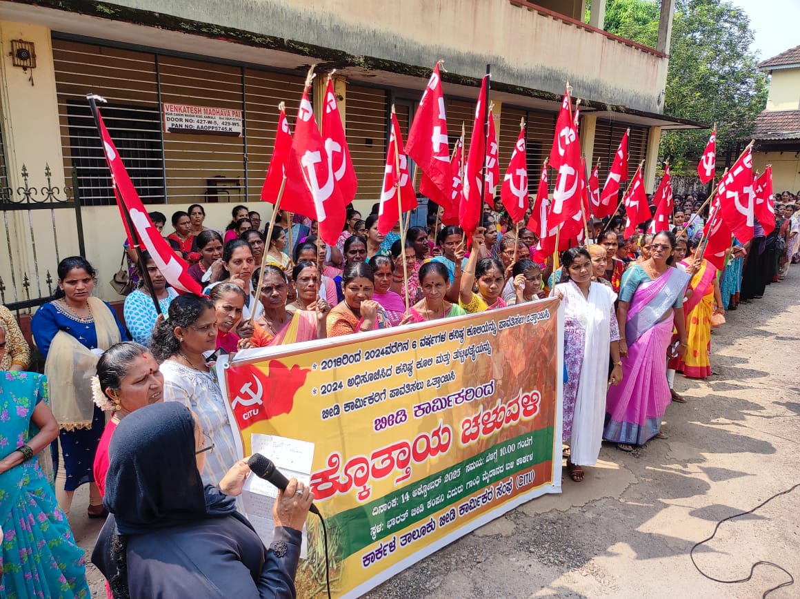 ಕಾರ್ಕಳ: ಅಕ್ಟೋಬರ್ 14:ಬೀಡಿ ಕಾರ್ಮಿಕರ ಸಮಸ್ಯೆಗಳನ್ನು ಕೂಡಲೇ ಬಗೆಹರಿಸಲು ಒತ್ತಾಯಿಸಿ ದ.ಕ ಮತ್ತು ಉಡುಪಿ ಜಿಲ್ಲಾ ಬೀಡಿ ಕಾರ್ಮಿಕರ ಸಂಘಗಳ ಜಂಟಿ ಕ್ರೀಯಸಮಿತಿ ನೇತ್ರತ್ವದಲ್ಲಿ 7/10/25 ರಿಂದ 17/10/25 ವರೆಗೆ ಎರಡು ಜಿಲ್ಲೆಯ ಎಲ್ಲಾ ಕಂಪನಿಗಳ ಮುಂದೆ ಹಕ್ಕೊತ್ತಾಯ ಚಳುವಳಿಗೆ ಕರೆ ನೀಡಿದ್ದು ಕಾರ್ಕಳದಲ್ಲಿ ಇಂದು ಭಾರತ್ ಬೀಡಿ ಕಂಪನಿ ಮುಂದೆ ಬ್ರಹತ್ ಪ್ರತಿಭಟನೆ ನಡೆಸಿ 2018 ರಿಂದ 2024 ವರೆಗೆ ಬಾಕಿಇರುವ ಹೆಚ್ಚಳ ವಾದ ಕನಿಷ್ಟಕೂಲಿ 40 ರೂ ಹಾಗೂ ತುಟ್ಟಿಭತ್ಯೆ ಹಣ ಕೂಡಲೇ ನೀಡಲು ಒತ್ತಾಯಿಸಿ ಹಕ್ಕೊತ್ತಾಯ ಚಳುವಳಿ ನಡೆಸಿದರು.ಕರ್ನಾಟಕ ರಾಜ್ಯ ಬೀಡಿ ಫೆಡರೇಶನ್ ಉಪಾಧ್ಯಕ್ಷ ವಸಂತ ಆಚಾರಿ ಮಾತಾಡಿ ಕಾರ್ಮಿಕರಿಗೆ ಕಾನೂನು ಬದ್ದ ವಾಗಿ ಸಿಗಬೇಕಾದ ತುಟ್ಟಿಭತ್ಯೆ, ಬಾಕಿ ಇಟ್ಟುಕೊಂಡಿರುವ. ಕಾರ್ಮಿಕರ ಸಾವಿರಾರು ಕೋಟಿ ಹಣ ಕೂಡಲೇ ನೀಡದಿದ್ದಲ್ಲಿ ಕಂಪನಿ ಮುಂದೆ ಅಮರಣಾಂತ ಉಪವಾಸ ಸತ್ಯಾಗ್ರಹ ಕಾರ್ಮಿಕರು ತಯಾರಾಗ ಬೇಕೆಂದು ಪ್ರತಿಭಟನೆಯಲ್ಲಿ ಕರೆ ನೀಡಿದರು. ಇವತ್ತು ಭಾರತ್ ಬೀಡಿ ಮಾಲೀಕರು ಬೀಡಿ ಉದ್ಯಮ ಹಣದಿಂದ ಬೇರೆ ಬೇರೆ ಕಂಪನಿ ಗಳನ್ನು ಆರಂಬಿಸಿದ್ದು ಬೀಡಿ ಕಾರ್ಮಿಕರು ಬೇವರು ಸುರಿಸಿ ದುಡಿದ ಹಣದಿಂದ ಇತ್ತೀಚಿಗೆ ಭಾರತ್ ಬೀಡಿ ಮಾಲಿಕರು 30 ನಂಬ್ರ ಹೆಸರಿನಲ್ಲಿ ಟೀ ಪುಡಿ ಉದ್ಯಮ ಆರಂಭಿಸಿದ್ದಾರೆ