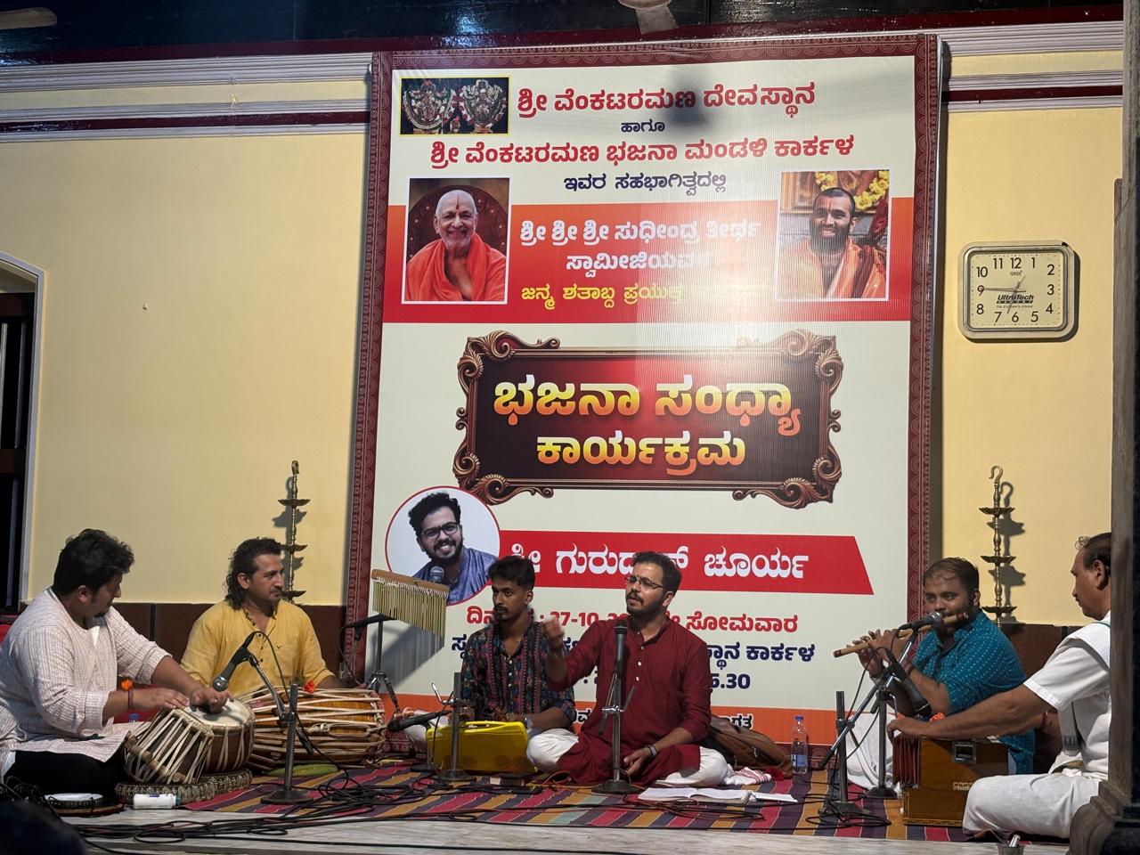 ಕಾರ್ಕಳ: ಅಕ್ಟೋಬರ್ 28:ಪಡುತಿರುಪತಿ ಕೀರ್ತಿಯ ಕಾರ್ಕಳ ಶ್ರೀ ವೆಂಕಟರಮಣ ದೇವಳದಲ್ಲಿ ವೆಂಕಟರಮಣ ಭಜನಾ ಮಂಡಳಿಯ ಸಹಯೋಗದಲ್ಲಿ ಭಜನ್ ಸಂಧ್ಯಾ ಕಾರ್ಯಕ್ರಮವು ಈ ಸೋಮವಾರ ಸಂಜೆ ನಡೆಯಿತು. ಮಂಗಳೂರಿನ ಖ್ಯಾತ ಯುವ ಸಂಗೀತ ಕಲಾವಿದರಾದ ಗುರುದಾಸ್ ಚೂರ್ಯ ಅವರು ಈ ಭಕ್ತಿ ಸಂಗೀತದ ವಿಶೇಷವಾದ ಕಾರ್ಯಕ್ರಮವನ್ನು ಅತ್ಯಂತ ಸುಂದರವಾಗಿ ನಡೆಸಿಕೊಟ್ಟರು. ಕಾಶಿ ಮಠಾಧೀಶರಾದ ಶ್ರೀ ಸುಧೀಂದ್ರ ತೀರ್ಥ ಸ್ವಾಮೀಜಿಯವರ ಜನ್ಮ ಶತಮಾನೋತ್ಸವದ ಅಂಗವಾಗಿ ನಡೆದ ಈ ಕಾರ್ಯಕ್ರಮವನ್ನು ದೇವಳದ ಪುರಾಣಿಕರಾದ ರವೀಂದ್ರ ಪುರಾಣಿಕ್, ದೇವಳದ ಪ್ರಥಮ ಮೊಕ್ತೇಸರರಾದ ಜಯರಾಮ್ ಪ್ರಭು ಮತ್ತು ಡಾಕ್ಟರ್ ಮಂಜುನಾಥ್ ಕಿಣಿ ಅವರು ಜೊತೆಯಾಗಿ ದೀಪ ಬೆಳಗಿಸಿ ಉದ್ಘಾಟನೆ ಮಾಡಿದರು.