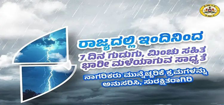 ಮುಂದಿನ 7 ದಿನ ಕರಾವಳಿ ಜಿಲ್ಲೆಗಳಿಗೆ ಆರೆಂಜ್ ಅಲರ್ಟ್, ಬೆಳಗಾವಿ, ಧಾರಾವಾಡ, ಚಿಕ್ಕಮಗಳೂರು, ಹಾಸನ, ಕೊಡಗು, ಶಿವಮೊಗ್ಗ ಜಿಲ್ಲೆಗಳಿಗೆ ಯೆಲ್ಲೋ ಅಲರ್ಟ್ ಘೋಷಿಸಲಾಗಿದೆ. ದಕ್ಷಿಣ ಕನ್ನಡ ಜಿಲ್ಲೆಯ ಒಂದೆರಡು ಕಡೆಯಲ್ಲಿ ಗಂಟೆಗೆ 30 ರಿಂದ 40 ಕಿಲೋಮೀಟರ್ ವೇಗದಲ್ಲಿ ಗಾಳಿಯೊಂದಿಗೆ ಭಾರೀ ಮಳೆಯಾಗುವ ಸಂಭವವಿದೆ. ಉತ್ತರ ಹಾಗೂ ದಕ್ಷಿಣ ಒಳನಾಡಿನ ಎಲ್ಲಾ ಜಿಲ್ಲೆಗಳಲ್ಲಿ ಭಾರೀ ಮಳೆಯಾಗುವ ಕಾರಣ ಯೆಲ್ಲೋ ಅಲರ್ಟ್ ನೀಡಲಾಗಿದೆ.