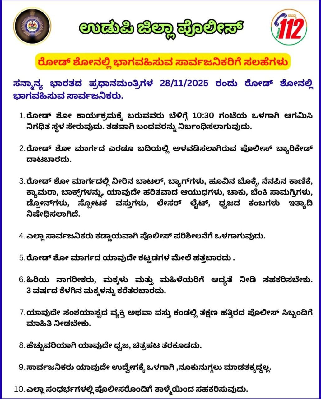ಉಡುಪಿ:ನವೆಂಬರ್ 27:ಸನ್ಮಾನ್ಯ ಭಾರತದ ಪ್ರಧಾನಮಂತ್ರಿಗಳ 28/11/2025 ರಂದು ರೋಡ್ ಶೋನಲ್ಲಿ ಭಾಗವಹಿಸುವ ಸಾರ್ವಜನಿಕರಿಗೆ ಉಡುಪಿ ಜಿಲ್ಲಾ ಪೊಲೀಸ್ ನೀಡಿರುವ ಸೂಚನೆ ಗಳು ಹೀಗಿವೆ