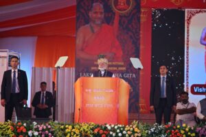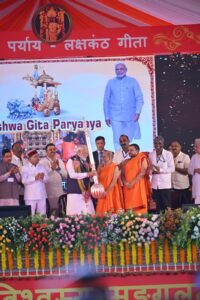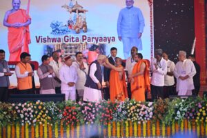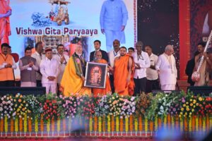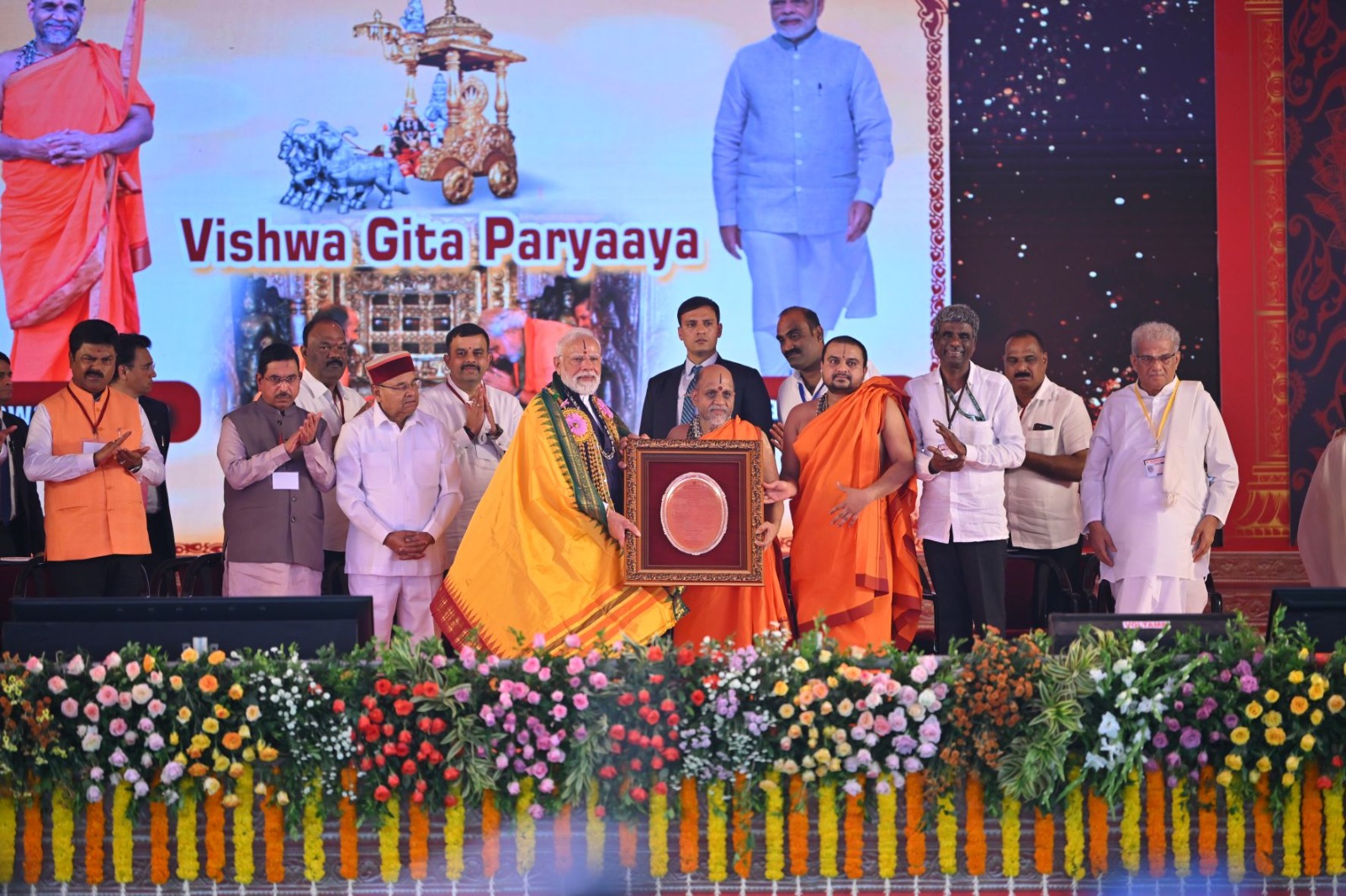 ಉಡುಪಿ:ಪರ್ಯಾಯ ಪುತ್ತಿಗೆ ಮಠಾಧೀಶ ಸುಗುಣೇಂದ್ರ ತೀರ್ಥ ಸ್ವಾಮೀಜಿ ಅವರು ಉಡುಪಿಯ ಶ್ರೀಕೃಷ್ಣ ಮಠದಲ್ಲಿ ಹಮ್ಮಿಕೊಂಡಿರುವ ಲಕ್ಷಕಂಠ ಗೀತಾ ಪಠಣ ಕಾರ್ಯಕ್ರಮದಲ್ಲಿ ಪ್ರಧಾನಿ ನರೇಂದ್ರ ಮೋದಿ ಅವರಿಗೆ ಭಾರತ ಭಾಗ್ಯ ವಿಧಾತ ಬಿರುದು ನೀಡಿ ಸನ್ಮಾನಿಸಿದರು