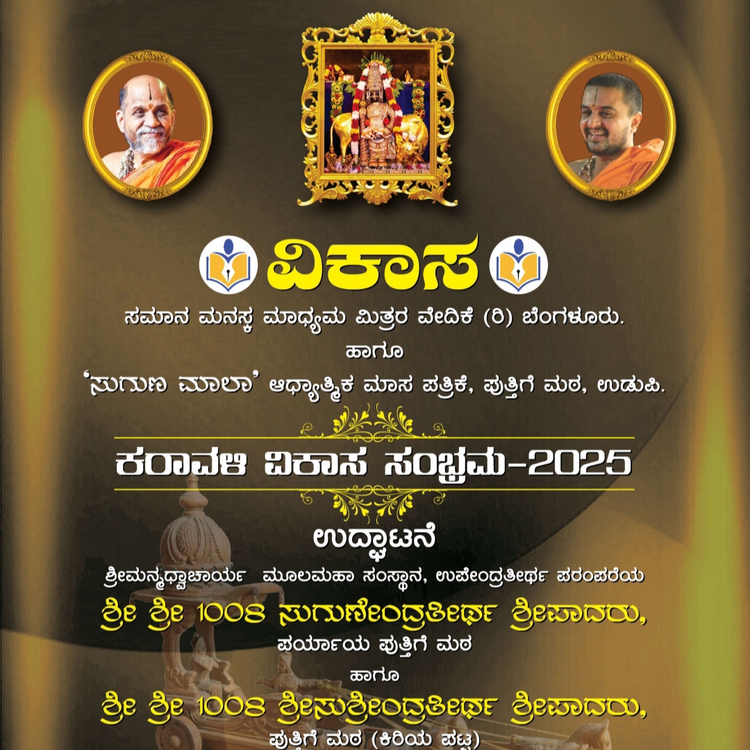 ಉಡುಪಿ: ಡಿಸೆಂಬರ್ 04:ಉಡುಪಿಯ ಪರ್ಯಾಯ ಶ್ರೀಪುತ್ತಿಗೆ ಮಠ ಮತ್ತು ‘ವಿಕಾಸ’- ಸಮಾನ ಮನಸ್ಕ ಮಾಧ್ಯಮ ಮಿತ್ರರ ವೇದಿಕೆ, ಬೆಂಗಳೂರು ಇವರ ಸಂಯುಕ್ತ ಆಶ್ರಯದಲ್ಲಿ ಡಿಸೆಂಬರ್ ಆರರಂದು ಬೆಳಿಗ್ಗೆ 9:30 ರಿಂದ ಸಂಜೆ 5 .00ರವರೆಗೆ ಉಡುಪಿ ಕೃಷ್ಣ ಮಠದ ರಾಜಾಂಗಣ ಎದುರಿನ ಗೀತಾ ಮಂದಿರದ 5ನೇ ಮಹಡಿಯ ಪುತ್ತಿಗೆ ನರಸಿಂಹ ಸಭಾಭವನದಲ್ಲಿ ‘ಕರಾವಳಿ ವಿಕಾಸ ಸಂಭ್ರಮ’ ಕಾರ್ಯಕ್ರಮವನ್ನು ಆಯೋಜಿಸಿದೆ .