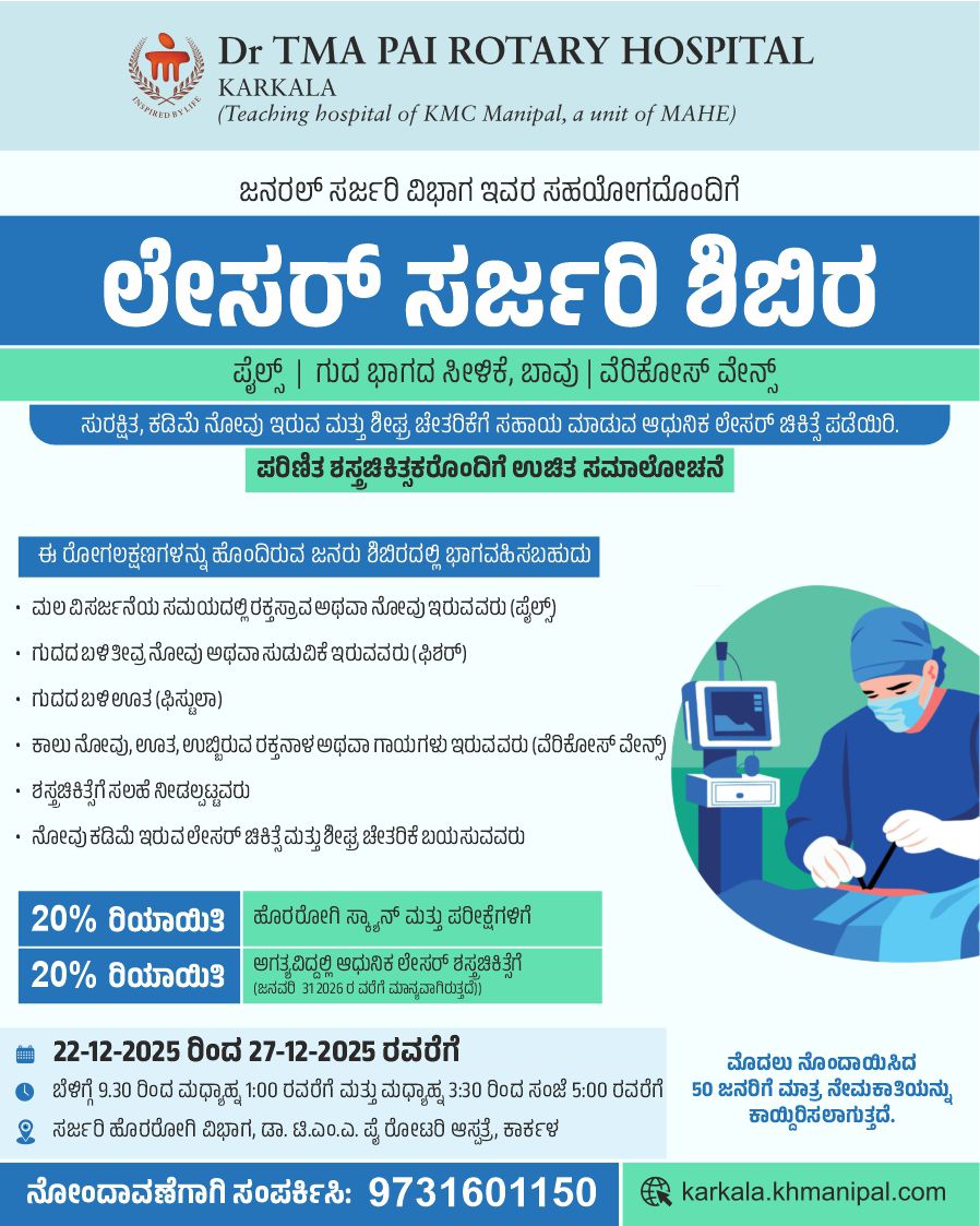 ಕಾರ್ಕಳ, ಡಿಸೆಂಬರ್ 20:ಡಾ. ಟಿ.ಎಂ.ಎ. ಪೈ ರೋಟರಿ ಆಸ್ಪತ್ರೆ, ಕಾರ್ಕಳದಲ್ಲಿ ಡಿಸೆಂಬರ್ 22ರಿಂದ 27, ರವರೆಗೆ, ಬೆಳಿಗ್ಗೆ 9:30ರಿಂದ 1:00 ಮತ್ತು ಸಂಜೆ 3:30ರಿಂದ 5:00 ಗಂಟೆಯವರೆಗೆ, ಲೇಸರ್ ಶಸ್ತ್ರಚಿಕಿತ್ಸಾ ಶಿಬಿರವನ್ನು ಆಯೋಜಿಸಲಾಗುತ್ತಿದೆ. ಈ ಶಿಬಿರದಲ್ಲಿ ಪೈಲ್ಸ್ (ಹೆಮರಾಯಿಡ್ಸ್), ಗುದ ಭಾಗದ ಸೀಳಿಕೆ, ಬಾವು, (ವೆರಿಕೋಸ್ ವೇನ್ಸ್ ) ಕಾಲಿನಲ್ಲಿ ಉಬ್ಬಿರುವ ರಕ್ತನಾಳ, ರೋಗಗಳ ತಪಾಸಣೆ ಸಮಾಲೋಚನೆ ಲಭ್ಯವಿರುತ್ತದೆ