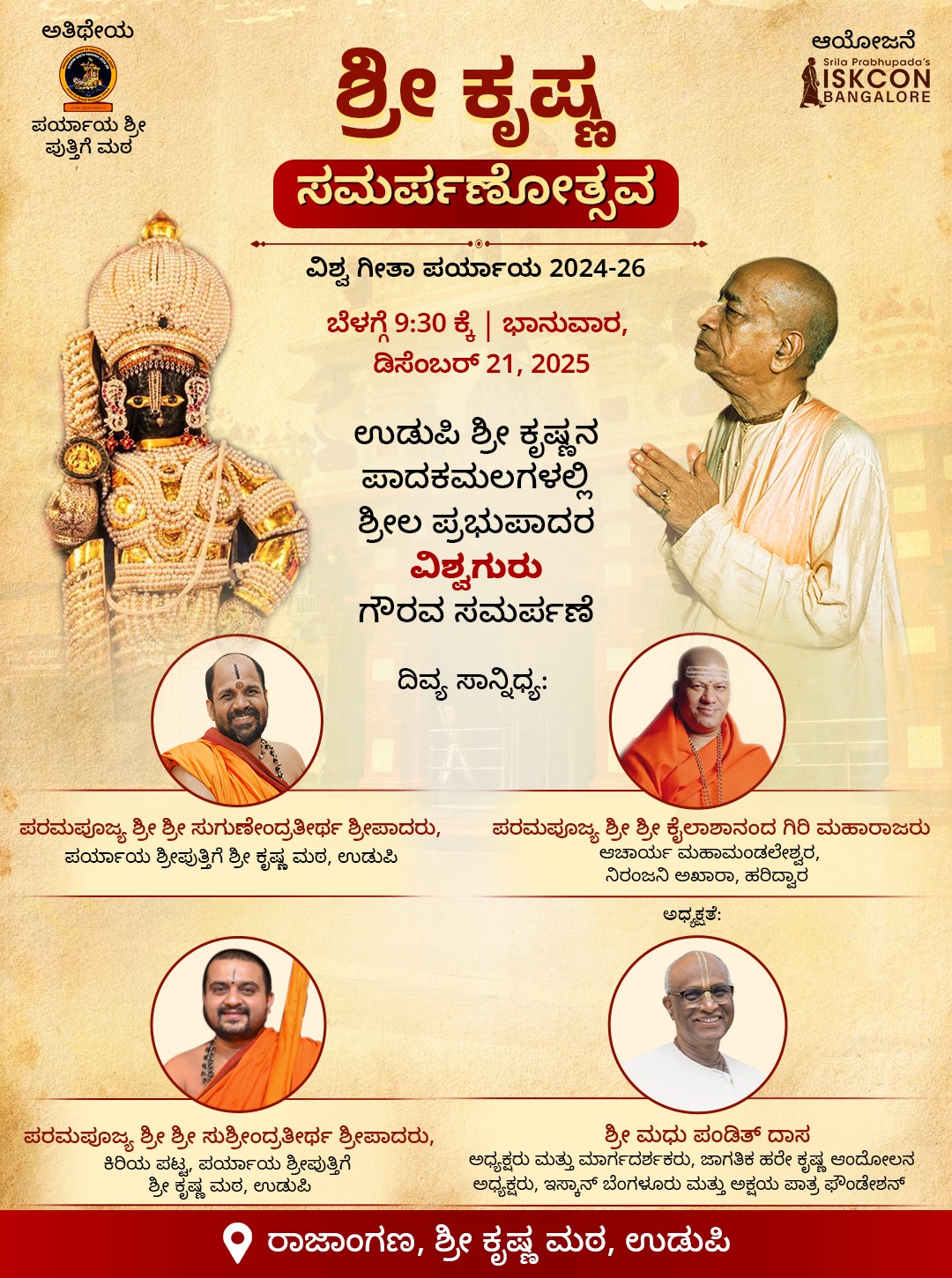 ಪ್ರಯಾಗ್ರಾಜ್ನಲ್ಲಿ ನಡೆದ ಮಹಾಕುಂಭ ಮೇಳ ಸಂದರ್ಭದಲ್ಲಿ ಶ್ರೀ ಪ್ರಭುಪಾದರಿಗೆ ವಿಶ್ವಗುರು ಬಿರುದು ನೀಡಿ ಗೌರವಿಸಿದ ಹಿನ್ನೆಲೆಯಲ್ಲಿ ಉಡುಪಿ ಕೃಷ್ಣ ಸನ್ನಿಧಿಗೆ ಬಿರುದು ಸಮರ್ಪಿಸಲಾಗುವುದು.
