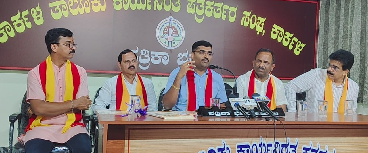ಕಾರ್ಕಳ ಪತ್ರಿಕಾ ಭವನದಲ್ಲಿ ಸೋಮವಾರ ಕಾರ್ಕಳ ತಾಲೂಕು ಕ.ಸಾ.ಪ ವತಿಯಿಂದ ನಡೆದ ಪತ್ರಿಕಾಗೋಷ್ಠಿಯನ್ನು ಉದ್ದೇಶಿಸಿ ಮಾತನಾಡಿದರು.