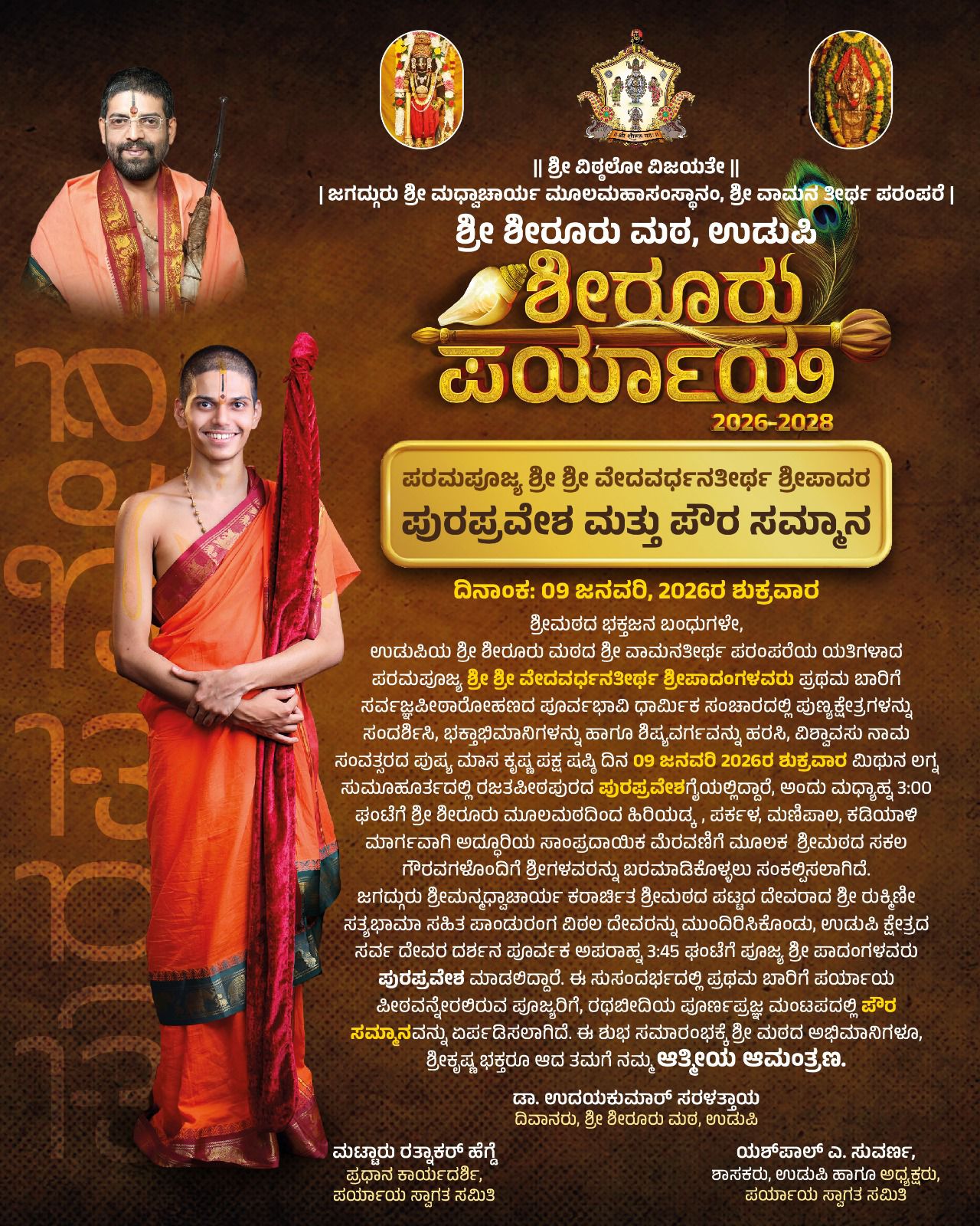 ಉಡುಪಿ:ಜನವರಿ 08: ಶಿರೂರು ಮಠದ ಶ್ರೀ ವೇದವರ್ಧನ ತೀರ್ಥ ಶ್ರೀಪಾದರು ತಮ್ಮ ಪ್ರಥಮ ಪರ್ಯಾಯೋತ್ಸವಕ್ಕೆ ಪೂರ್ವಭಾವಿಯಾಗಿ ಪುಣ್ಯ ಕ್ಷೇತ್ರಗಳ ಸಂದರ್ಶನ ನಡೆಸುತ್ತಿದ್ದು, ಜ. 9 ರಂದು ನಾಳೆ ಉಡುಪಿಗೆ ಹಿಂತಿರುಗಲಿದ್ದು, ಅವರನ್ನು ಅದ್ಧೂರಿಯ ಮೆರವಣಿಗೆಯಲ್ಲಿ ಬರ ಮಾಡಿಕೊಳ್ಳಲಾಗುವುದು