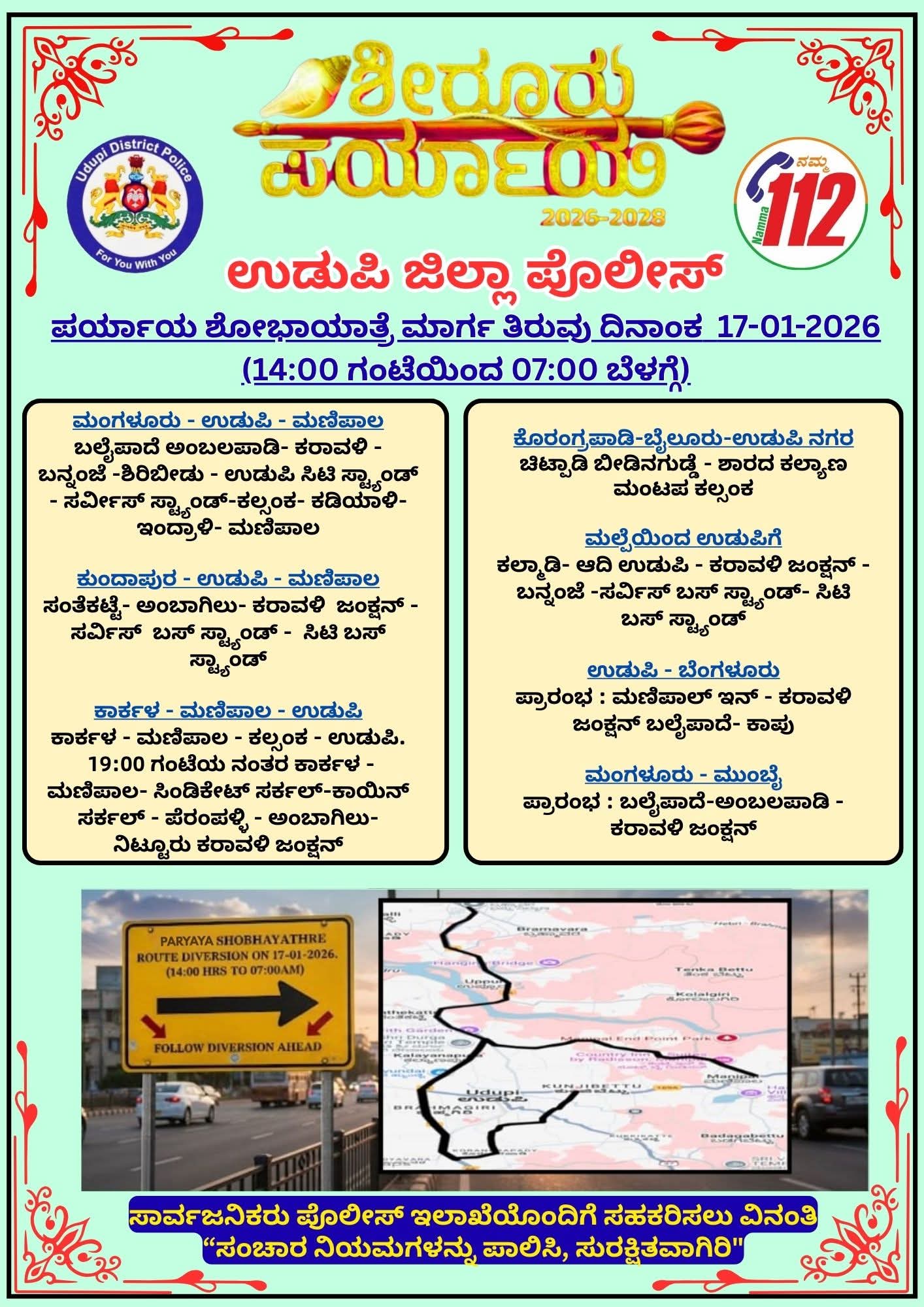 ಉಡುಪಿ : ಜನವರಿ 12:ಶ್ರೀಕೃಷ್ಣ ಪರ್ಯಾಯೋತ್ಸವದ ಹಿನ್ನೆಲೆಯಲ್ಲಿ ಉಡುಪಿ ಜಿಲ್ಲೆಯಲ್ಲಿ ಸಂಚಾರ ನಿಯಂತ್ರಣ ಹಾಗೂ ಮಾರ್ಗ ಬದಲಾವಣೆ ಮಾಡಿ ಸೂಚನೆ ನೀಡಲಾಗಿದ್ದು ಸಾರ್ವಜನಿಕರು ಪೊಲೀಸ್ ಸೂಚನೆಗಳಿಗೆ ಸಹಕರಿಸಿ, ಪರ್ಯಾಯ ಮಾರ್ಗಗಳನ್ನು ಬಳಸುವಂತೆ ಉಡುಪಿ ಜಿಲ್ಲಾ ಪೊಲೀಸ್ ಪ್ರಕಟಣೆ ತಿಳಿಸಿದೆ