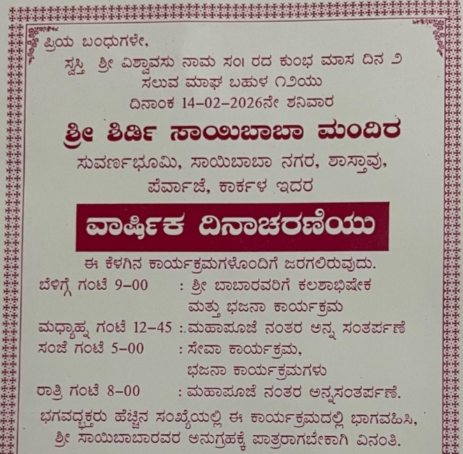 ಕಾರ್ಕಳ:ಫೆಬ್ರವರಿ 01:ಪೆರ್ವಾಜೆ ಕಾರ್ಕಳದಲ್ಲಿರುವ ಶ್ರೀ ಸಾಯಿ ಮಂದಿರದಲ್ಲಿ 13ನೇ ವರ್ಷದ ವರ್ಧಂತಿ ಉತ್ಸವವನ್ನು ದಿನಾಂಕ 14 ಫೆಬ್ರವರಿ 2026, ಶನಿವಾರ ರಂದು ಭಕ್ತಿಭಾವದಿಂದ ಆಚರಿಸಲಾಗುತ್ತದೆ.