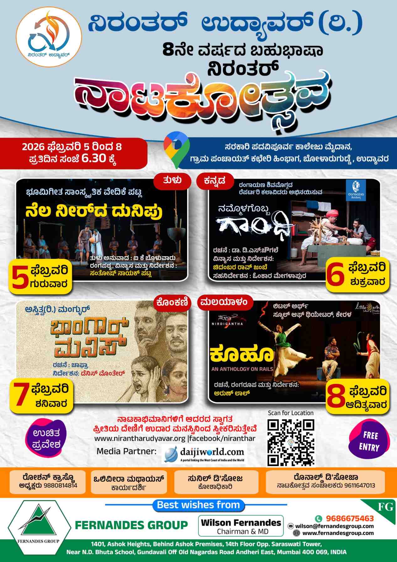 ಉದ್ಯಾವರ ಗ್ರಾಮ ಪಂಚಾಯತ್ ಕಚೇರಿಯ ಹಿಂಭಾಗದಲ್ಲಿರುವ ಕಾಲೇಜಿನ ಮೈದಾನದಲ್ಲಿ ಪ್ರತಿದಿನ ಸಂಜೆ ಗಂಟೆ 6.30ಕ್ಕೆ ಸರಿಯಾಗಿ ನಾಟಕಗಳು ಆರಂಭವಾಗಲಿವೆ. ಫೆಬ್ರವರಿ 5 ರಂದು ಭೂಮಿಗೀತಾ ಸಾಂಸ್ಕೃತಿಕ ವೇದಿಕೆ ಪಟ್ಲ ಇವರಿಂದ ‘ನೆಲ ನೀರ್’ದ ದುನಿಪು’ ಎಂಬ ತುಳು ನಾಟಕ, ಫೆಬ್ರವರಿ 6 ರoದು ರಂಗಾಯಣ ಶಿವಮೊಗ್ಗದ ರೆಪಟರಿ ಕಲಾವಿದರು ಅಭಿನಯಿಸುವ ‘ನಮ್ಮಳಗೊಬ್ಬ ಗಾಂಧಿ’ ಕನ್ನಡ ನಾಟಕ, ಫೆಬ್ರವರಿ 7ರಂದು ಅಸ್ತಿತ್ವ ಮಂಗಳೂರು ಇವರು ನಟಿಸುವ ಕೊಂಕಣಿ ನಾಟಕ ‘ಭಾoಗಾರ್ ಮುನಿಸ್’ ಮತ್ತು ಆದಿತ್ಯವಾರ ಫೆಬ್ರವರಿ 8ರಂದು ಲಿಟಲ್ ಅರ್ಥ್ ಸ್ಕೂಲ್ ಆಫ್ ಥಿಯೇಟರ್ ಕೇರಳ ಇವರಿಂದ ಮಲಯಾಳಂ ನಾಟಕ ‘ಕೂಹೂ’ ಪ್ರದರ್ಶನವಾಗಲಿದೆ. ಇದೇ ಸಂದರ್ಭದಲ್ಲಿ ಫೆಬ್ರವರಿ 7ರಂದು ನಡೆಯುವ ಕೊಂಕಣಿ ನಾಟಕದoದು ಸತತ 800 ಮೀಟರ್ ದೂರವನ್ನು ನಿರಂತರವಾಗಿ ಈಜುತ್ತಾ ಕೊಳಲು ವಾದನ ಮಾಡುವ ಮೂಲಕ ಗೋಲ್ಡನ್ ಬುಕ್ ಆಫ್ ವರ್ಲ್ಡ್ ರೆಕಾರ್ಡ್ ನಲ್ಲಿ ವಿಶ್ವದಾಖಲೆ ಸ್ಥಾಪಿಸಿರುವ ಉದ್ಯಾವರ ಮೂಲದ ಸಾಧಕ ರೂಬನ್ ಮಚಾದೊರವರನ್ನು ಸನ್ಮಾನಿಸುವ ಕಾರ್ಯಕ್ರಮವು ಇದೆ ಎಂದು ನಿರಂತರ್ ಉದ್ಯಾವರ ಸಂಘಟನೆಯ ಪ್ರಕಟಣೆ ತಿಳಿಸಿದೆ.