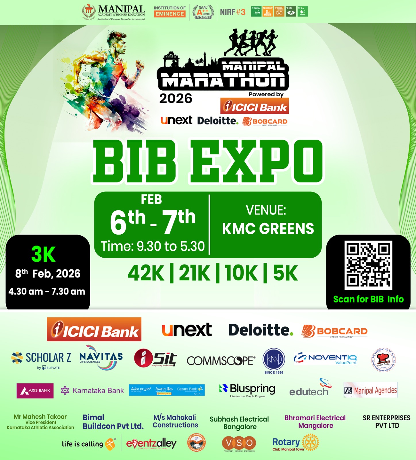 ಮಣಿಪಾಲ್, ಫೆಬ್ರವರಿ 5, 2026:ಬಹುನಿರೀಕ್ಷಿತ ಮಣಿಪಾಲ್ ಮ್ಯಾರಥಾನ್ 2026 ಫೆಬ್ರವರಿ 8, 2026 ರಂದು ನಡೆಯಲಿದ್ದು, ಈ ಮಹತ್ವದ ಕ್ರೀಡಾಕೂಟದ ಪೂರ್ವಭಾವಿಯಾಗಿ ಬಿಬ್ ಎಕ್ಸ್ಪೋವನ್ನು ಫೆಬ್ರವರಿ 6 ಮತ್ತು 7, 2026 ರಂದು ಮಣಿಪಾಲದ ಕೆಎಂಸಿ ಗ್ರೀನ್ಸ್ನಲ್ಲಿ ಆಯೋಜಿಸಲಾಗಿದೆ. ಬಿಬ್ ಎಕ್ಸ್ಪೋ ಬೆಳಿಗ್ಗೆ 9:30 ರಿಂದ ಸಂಜೆ 5:30 ರವರೆಗೆ ಎರಡು ದಿನಗಳ ಕಾಲ ನಡೆಯಲಿದೆ.