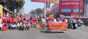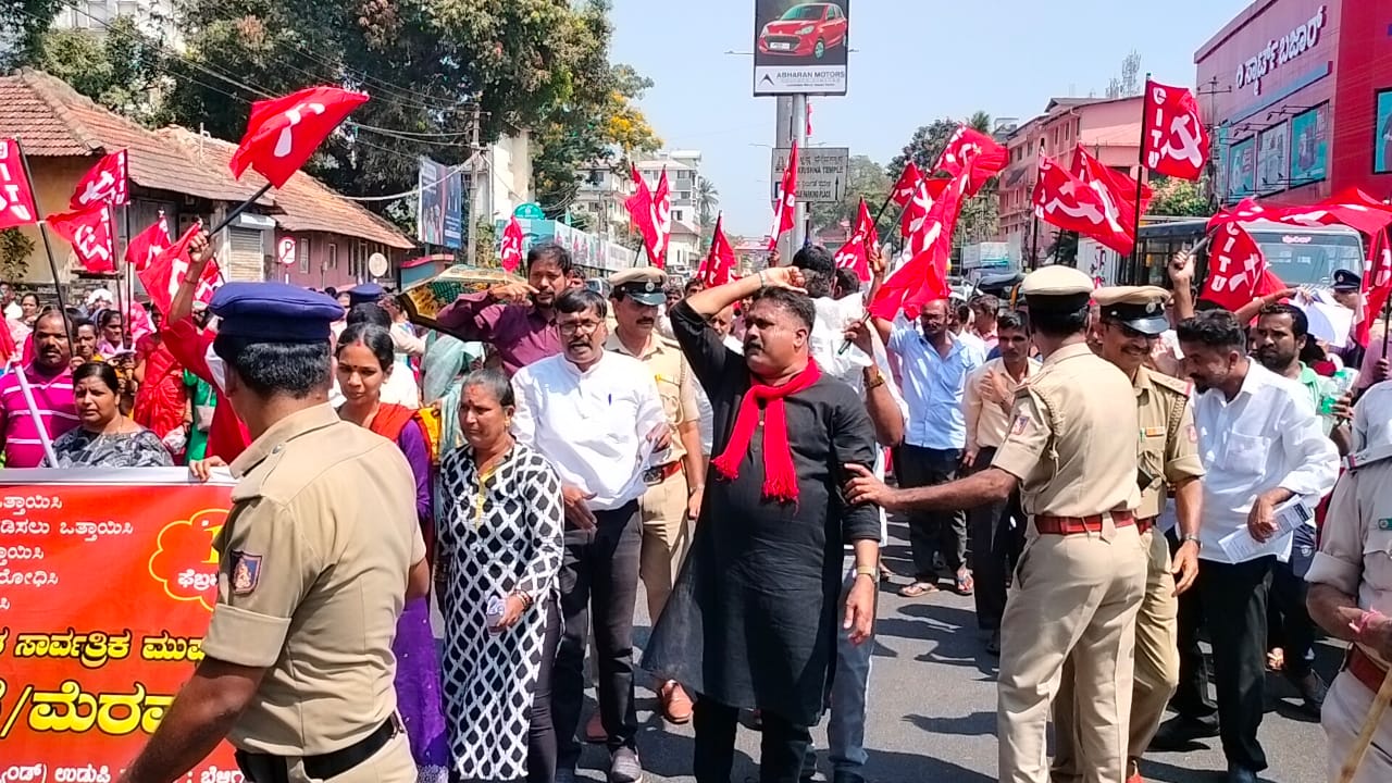 ನಗರದಲ್ಲಿ ನಡೆದ ಪ್ರತಿಭಟನಾ ಸಭೆಯ ನಂತರ ಮೆರವಣಿಗೆ ನಡೆಸಿದ ಪ್ರತಿಭಟನಾಕಾರರು ಜೊಡುಕಟ್ಟೆ ಬಳಿ ರಸ್ತೆ ತಡೆ ನಡೆಸಿ ತಮ್ಮ ಆಕ್ರೋಶ ವ್ಯಕ್ತಪಡಿಸಿದರು. ಸಭೆಯನ್ನು ಉದ್ದೇಶಿಸಿ ಮಾತನಾಡಿದ ಸಿಐಟಿಯು ರಾಜ್ಯ ಕಾರ್ಯದರ್ಶಿ ಸುರೇಶ್ ಕಲ್ಲಾಗಾರ್, ಕಾರ್ಮಿಕ ವಿರೋಧಿ ನೀತಿಗಳನ್ನು ಸರ್ಕಾರ ತಕ್ಷಣವೇ ಹಿಂಪಡೆಯಬೇಕು ಎಂದು ಒತ್ತಾಯಿಸಿದರು.