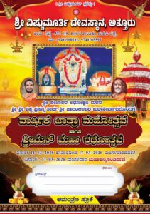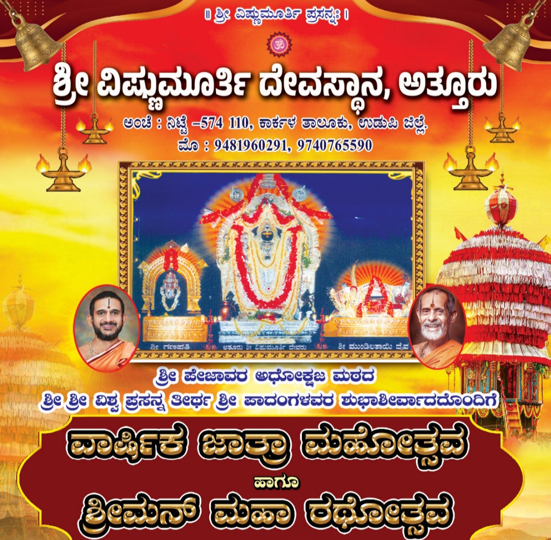 ಕಾರ್ಕಳ:ಫೆಬ್ರವರಿ 27:ಅತ್ತೂರು ಶ್ರೀ ವಿಷ್ಣುಮೂರ್ತಿ ದೇವಸ್ಥಾನದಲ್ಲಿ 2026ರ ಜಾತ್ರಾ ಮಹೋತ್ಸವ ಹಾಗೂ ಶ್ರೀಮನ್ ಮಹಾರಥೋತ್ಸವ ಮಾರ್ಚ್ 14ರಿಂದ ಮಾರ್ಚ್ 17ರವರೆಗೆ ನಡೆಯಲಿದೆ.