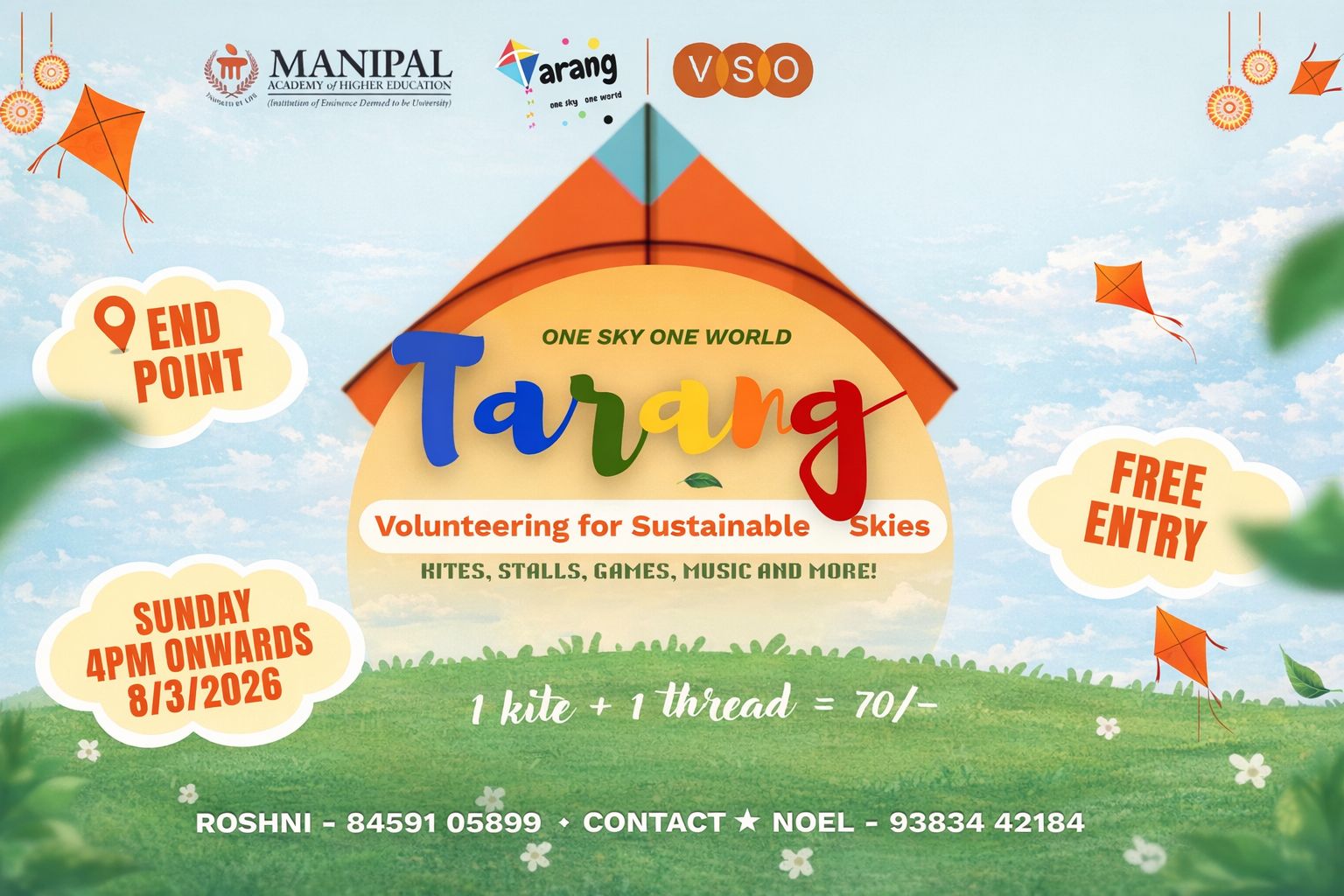 ಮಣಿಪಾಲ, ಮಾ. 03, 2026: Volunteer Services Organisation of Manipal Academy of Higher Education (VSO-MAHE) ವತಿಯಿಂದ ವಾರ್ಷಿಕ ಗಾಳಿಪಟೋತ್ಸವ ‘ತರಂಗ್ 2026’ರ 12ನೇ ಆವೃತ್ತಿ ಮಾರ್ಚ್ 08, ಭಾನುವಾರ ಸಂಜೆ 4:00 ಗಂಟೆಯಿಂದ ಮಣಿಪಾಲದ ಎಂಡ್ ಪಾಯಿಂಟ್ ಮೈದಾನದಲ್ಲಿ ನಡೆಯಲಿದೆ.