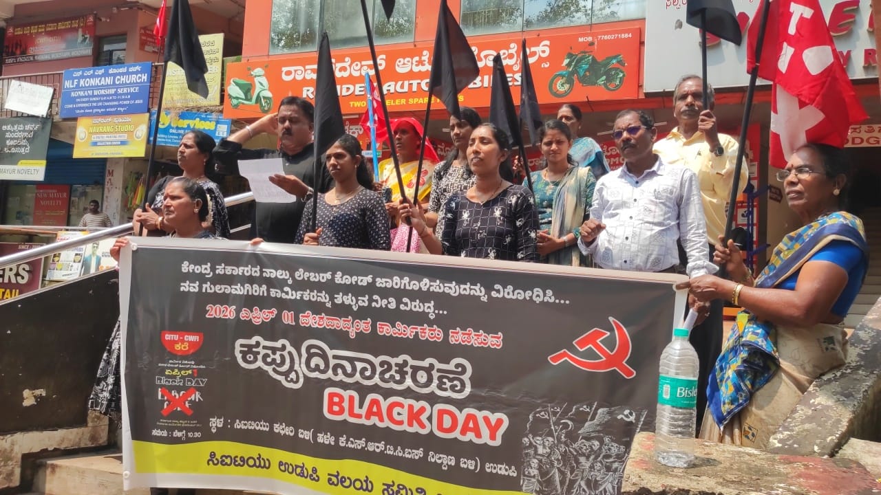 ಉಡುಪಿಯಲ್ಲಿ ಸಿಐಟಿಯು ಉಡುಪಿ ವಲಯ ಸಮಿತಿ ನೇತ್ರತ್ವದಲ್ಲಿ ಬಸ್ ನಿಲ್ದಾಣ ಬಳಿ ಕಾರ್ಮಿಕರು ಕಪ್ಪು ದಿನ ,ಪ್ರತಿಭಟನೆ ನಡೆಸಿದರು,ಪ್ರತಿಭಟನ ಸಭೆಯಲ್ಲಿ ಸಿಐಟಿಯು ಜಿಲ್ಲಾ ಅಧ್ಯಕ್ಷ ರಾದ ಶಶಿಧರ್ ಗೊಲ್ಲ ಮಾತನಾಡಿ ಕೇಂದ್ರ ಸರಕಾರ ಜಾರಿ ಮಾಡಿರುವ ಕಾರ್ಮಿಕ 4ಸಂಹಿತೆಗಳಿಂದ ಕಾರ್ಮಿಕರು ಬೀದಿಗೆ ಬಿಳುವಂತಾಗಿದೆ,ಕಾರ್ಮಿಕರಿಗೆ ಇನ್ನೂ ಮುಂದೆ ಸವಲತ್ತುಗಳು ಸಿಗಬೇಕಾದರೆ ಹಲವು ದಾಖಲೆಗಳನ್ನು ನೀಡಬೇಕಾಗುತ್ತದೆ, ಕೆಲಸದ ಅವಧಿಗಳು ಹೆಚ್ಚಳ ಮಾಡಿರುವುದು, ಕಾರ್ಮಿಕರ ಮುಷ್ಕರದ ಹಕ್ಕುಗಳನ್ನು ದುರ್ಬಲ ಗೊಳಿಸಿರುವುದು,ಕಾರ್ಮಿಕ ಸಂಘಗಳ ನೊಂದವಣಿಗಳಲ್ಲಿ ಬದಲಾವಣೆಗಳನ್ನು ಕೇಂದ್ರ ಸರಕಾರ ಇವತ್ತು ಜಾರಿಮಾಡಿದೆ.ಮಹಿಳೆಯರಿಗೆ ರಾತ್ರಿ ಪಾಳಿಯಲ್ಲಿ ಕೆಲಸ ಮಾಡಲು ಆವಕಾಶ ನೀಡಿದ್ದು ಇವರಿಗೆ ಸರಿಯಾದ ಸುರಕ್ಷತೆ, ಭದ್ರತೆ,ಆರೋಗ್ಯ ಸಮಸ್ಯೆ ಗಳನ್ನು ಎದುರಿಸಬೇಕಾಗಿದೆಎಂದು ಹೇಳಿದರು.