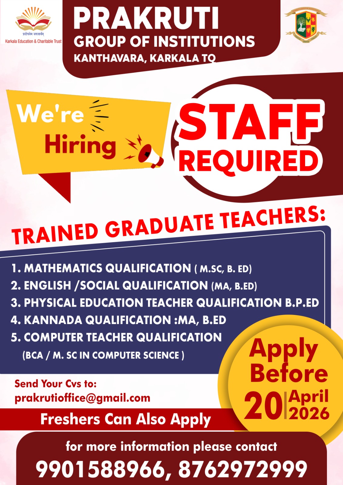 ಕಾರ್ಕಳ : ಕಾಂತಾವರದಲ್ಲಿರುವ ಪ್ರಕೃತಿ ಗ್ರೂಪ್ ಆಫ್ ಇನ್ಸ್ಟಿಟ್ಯೂಷನ್ಸ್ ವತಿಯಿಂದ ವಿವಿಧ ಶಿಕ್ಷಕರ ಹುದ್ದೆಗಳ ಭರ್ತಿಗೆ ಅರ್ಹ ಅಭ್ಯರ್ಥಿಗಳಿಂದ ಅರ್ಜಿಗಳನ್ನು ಆಹ್ವಾನಿಸಲಾಗಿದೆ.
